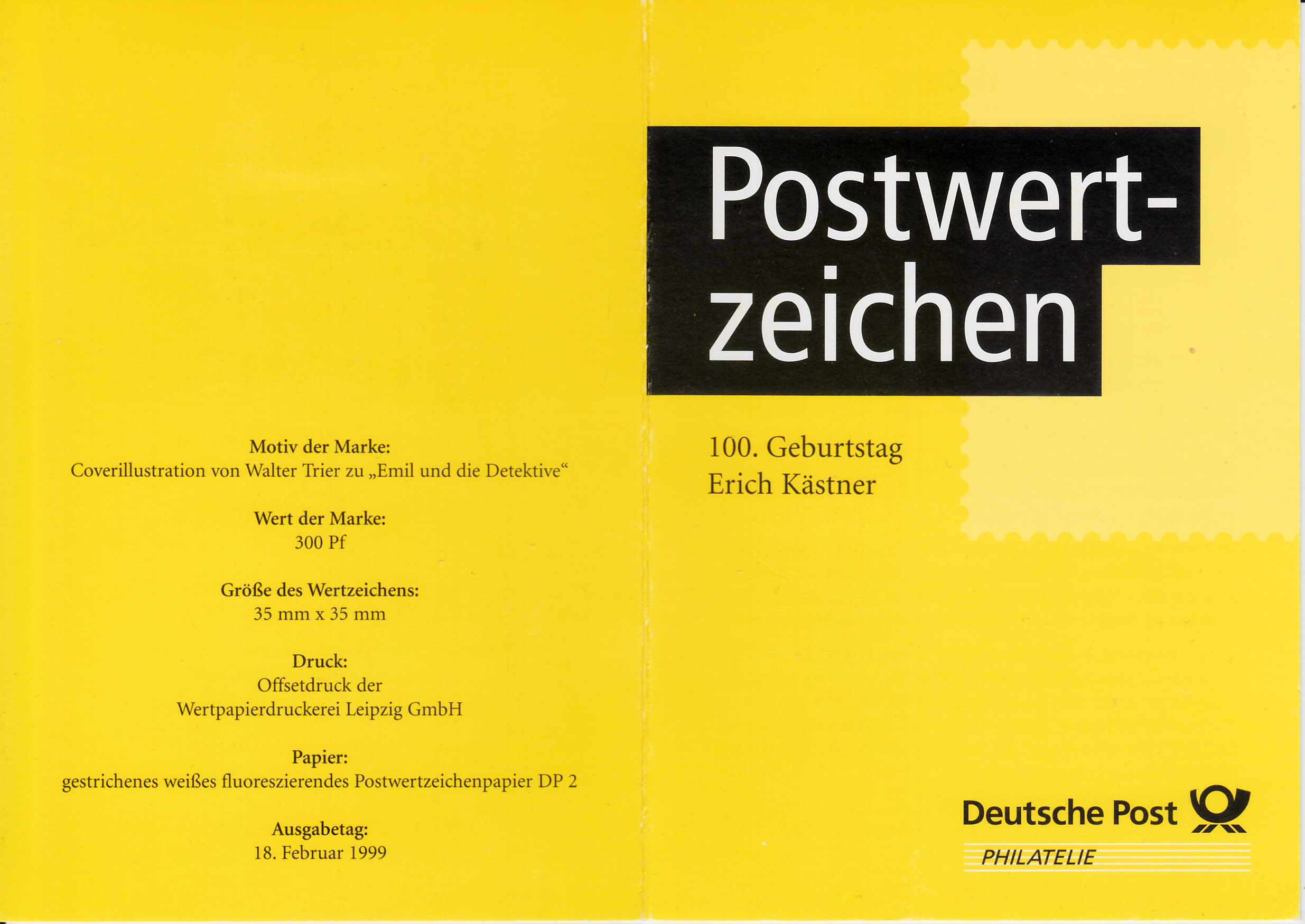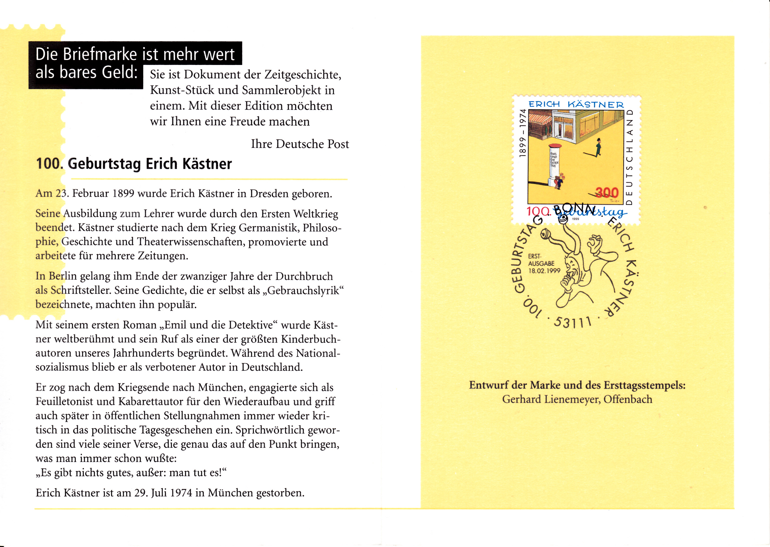 Klappkarte der Deutschen Post Philatelie mit der Marke und dem Ersttagsonderstempel Bonn. Auf der linken Innenseite der Klappkarte sind ein paar Informationen zu Erich Kästner zu lesen.
