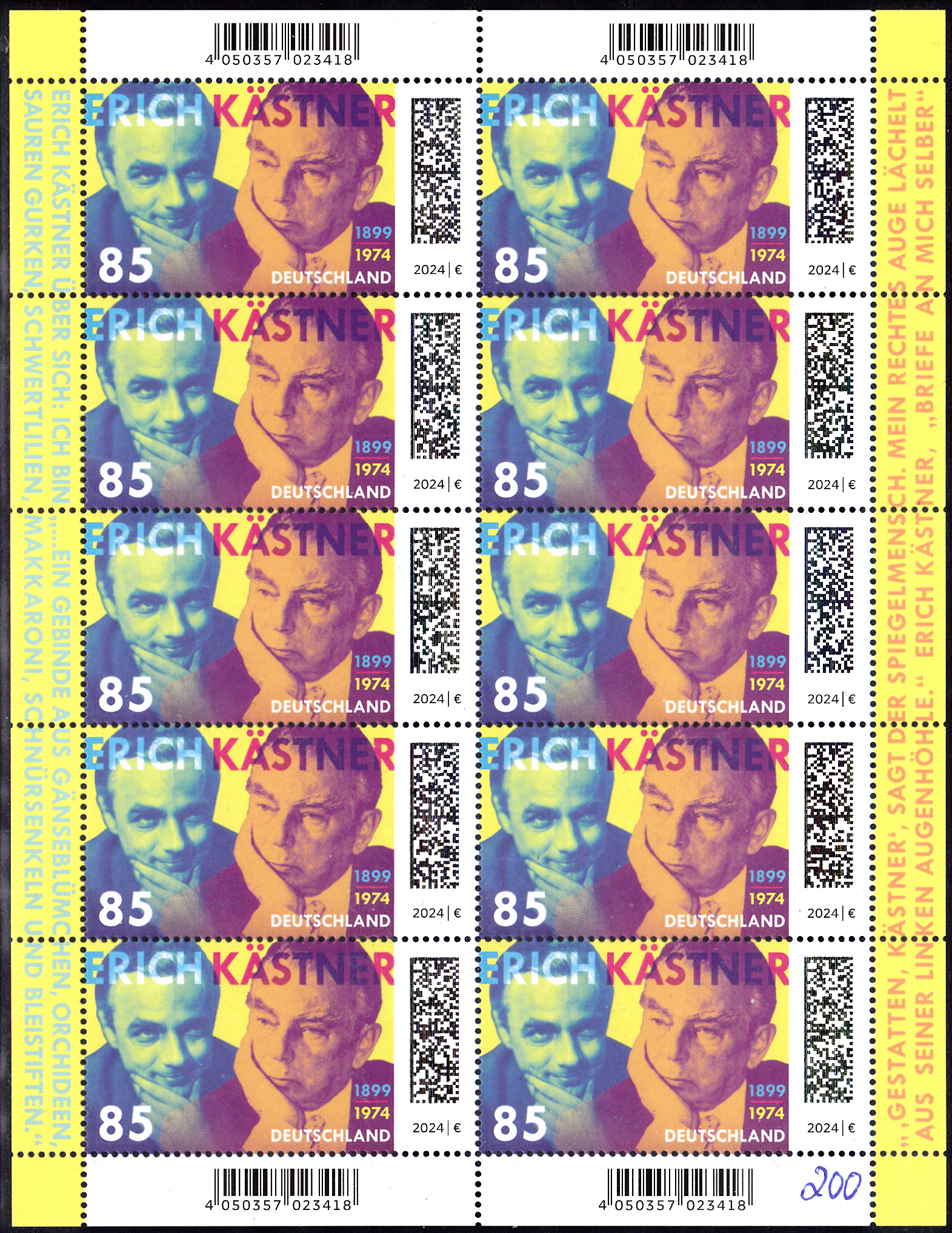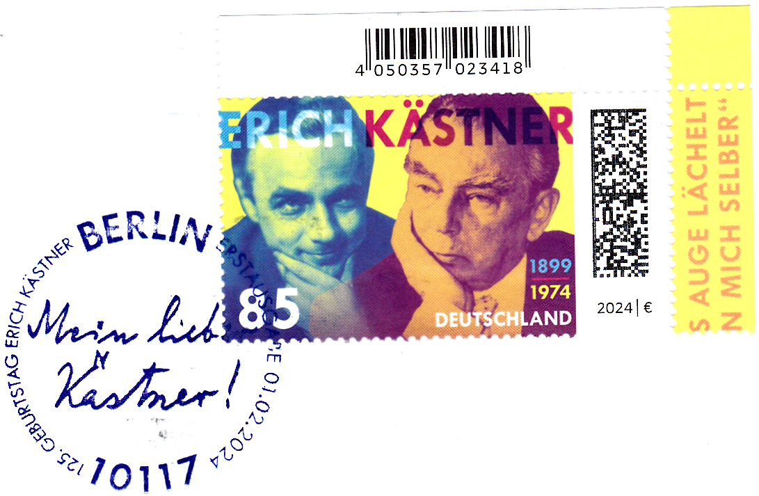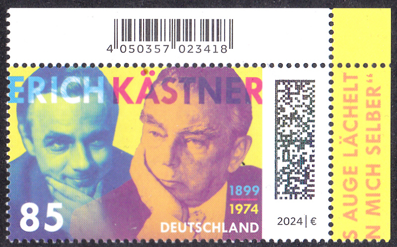 Zum 125. Geburtstag von Erich Kästner ist bei der Deutschen Post diese Marke (MiNr 3814) mit zwei verschiedenen Porträts von Erich Kästner erschienen. Hier zeige ich ein Eckrandstück mit EAN-Codierung.