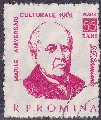 Diese Marke aus Rumänien zeigt ein Porträt von Domingo Faustino Sarmiento.