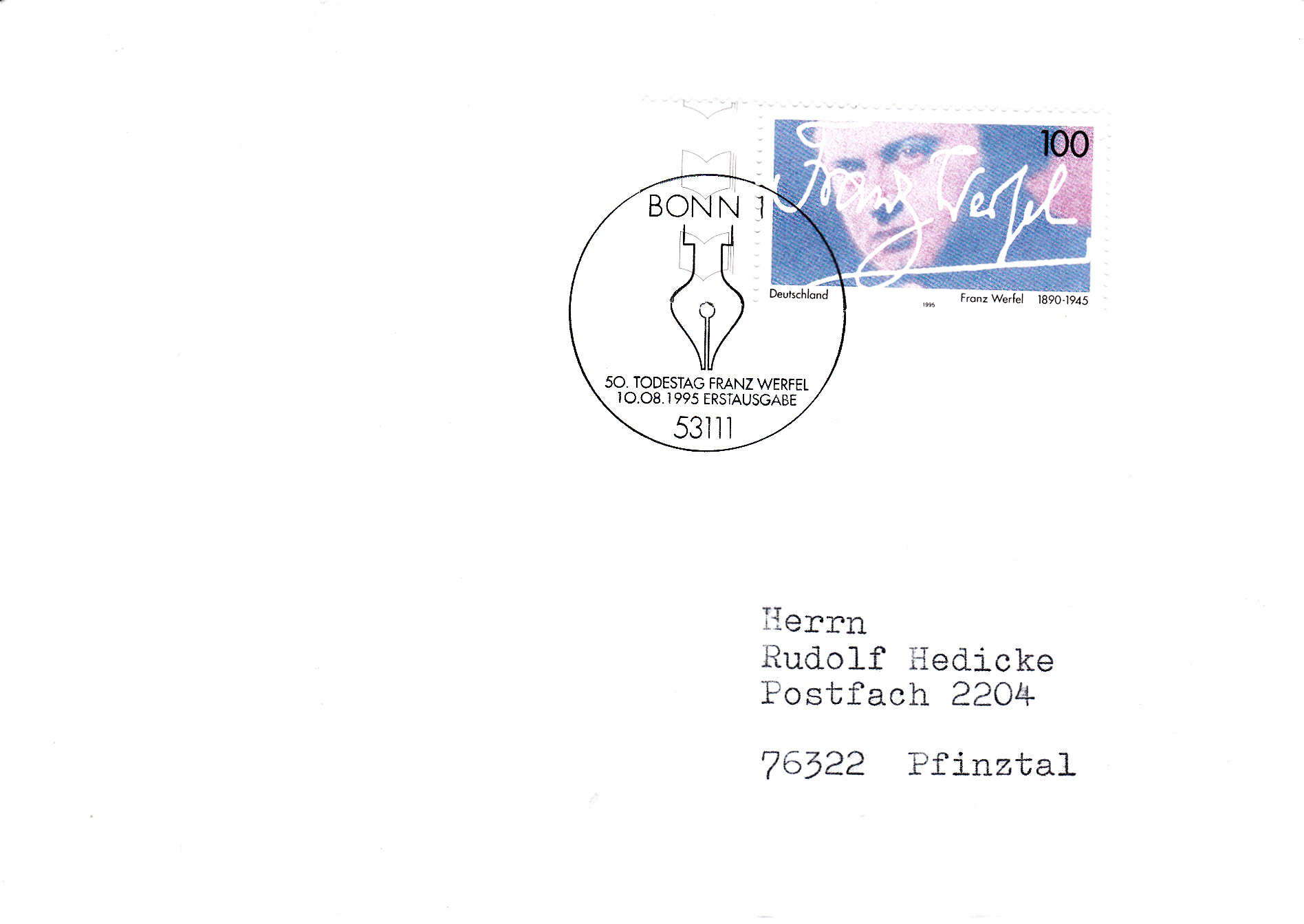 Auf diesem Briefumschlag wurde die Marke zum 50.Todestag von Franz Werfel mit dem Ersttagsonderstempel Bonn abgestempelt.