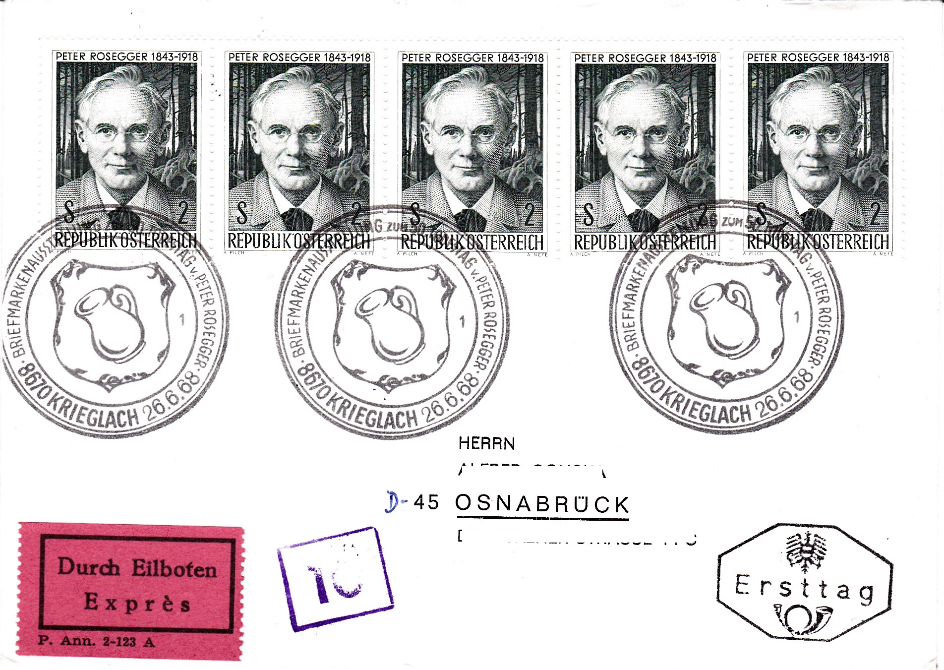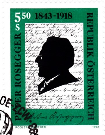 Zum 100. Geburtstag von Peter Rosegger ist im Deutschen Reich diese Marke (MiNr 856) mit seinem Porträt erschienen.