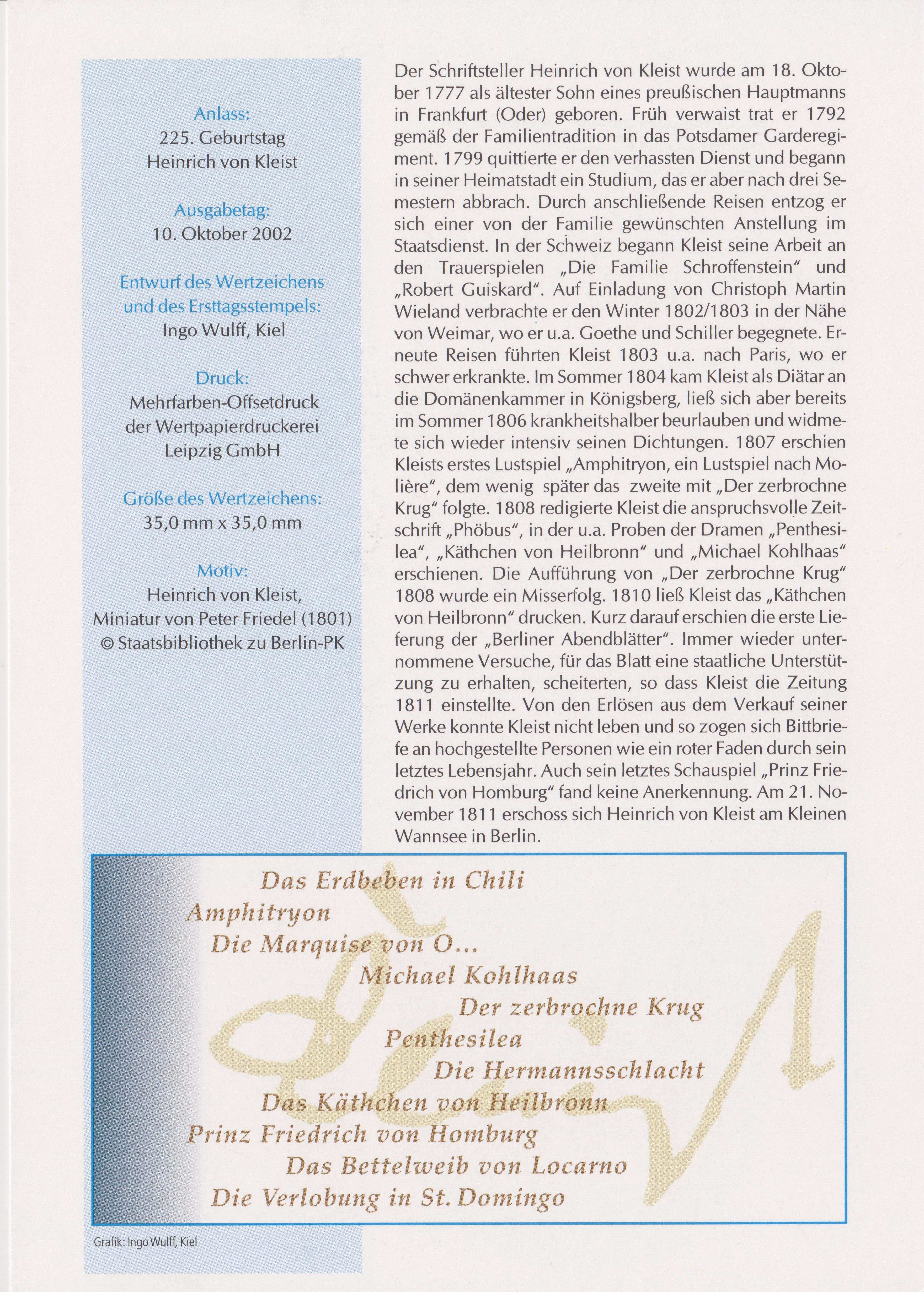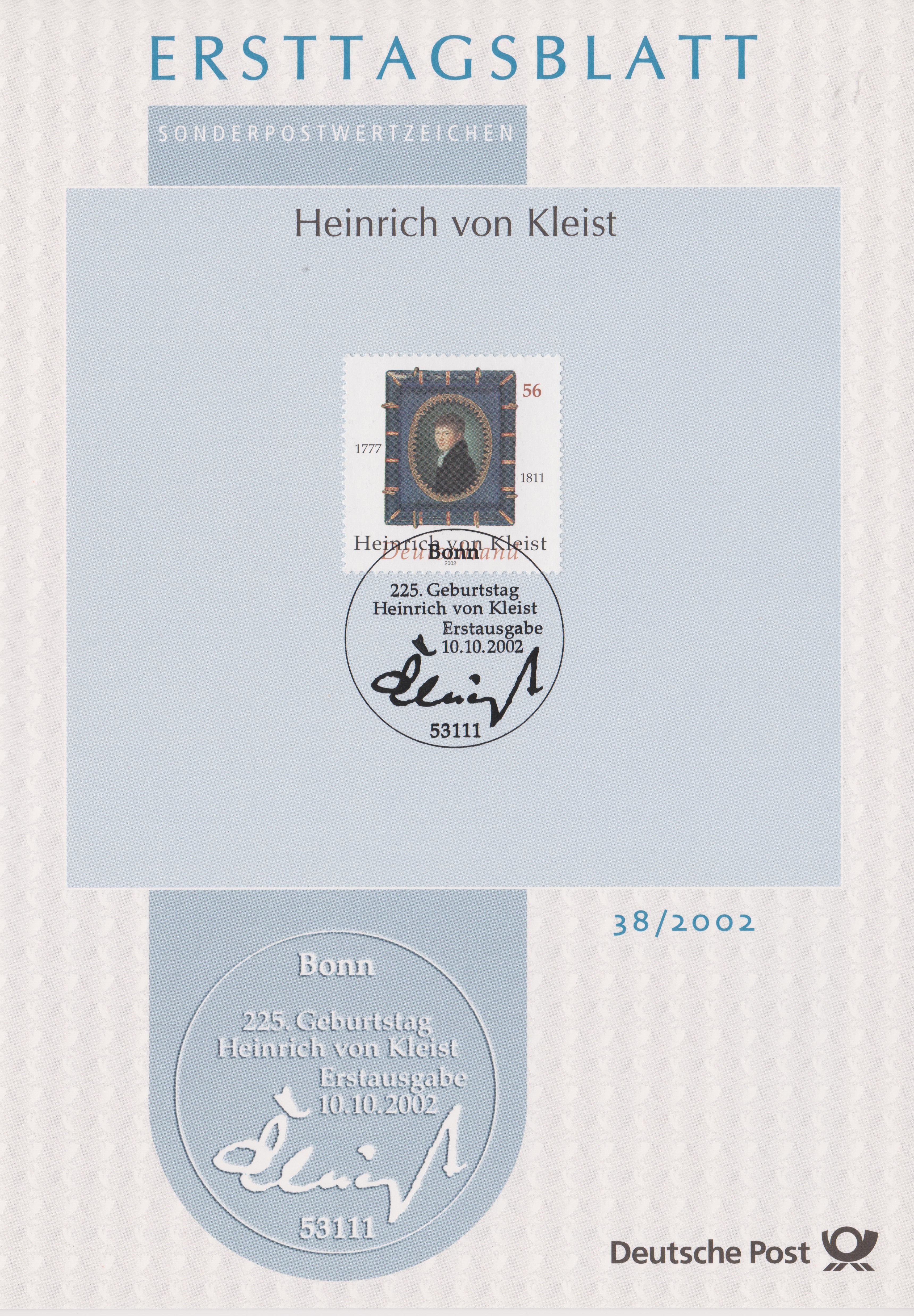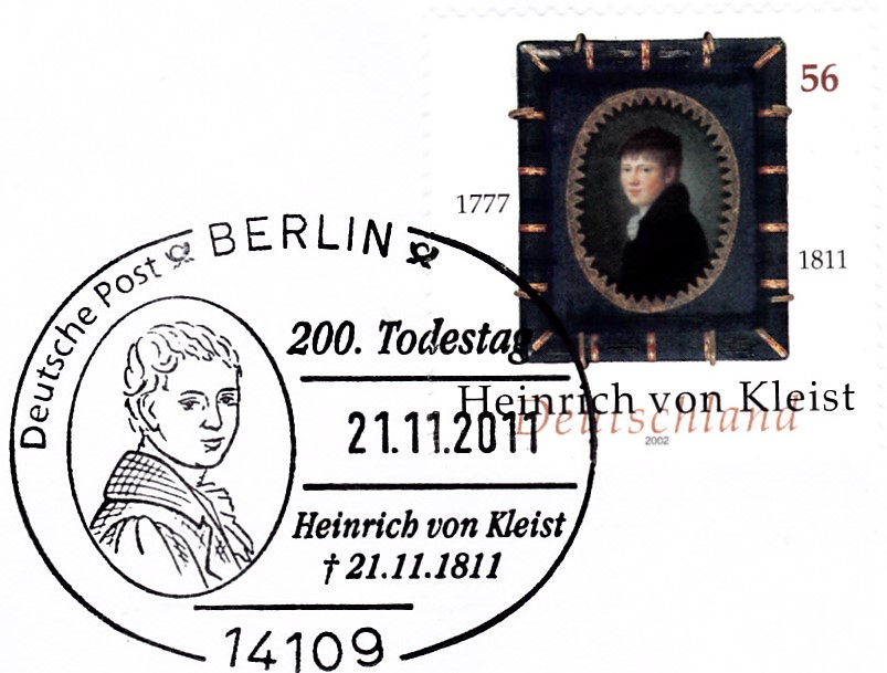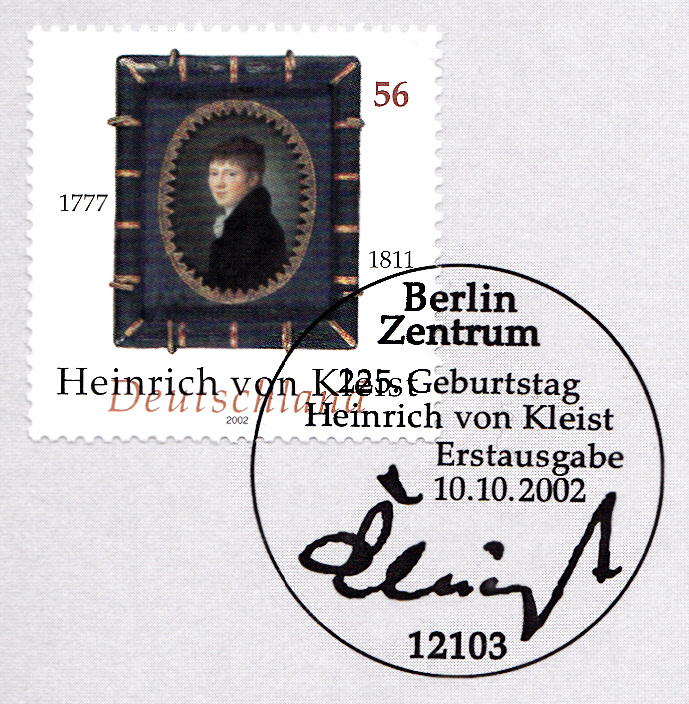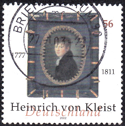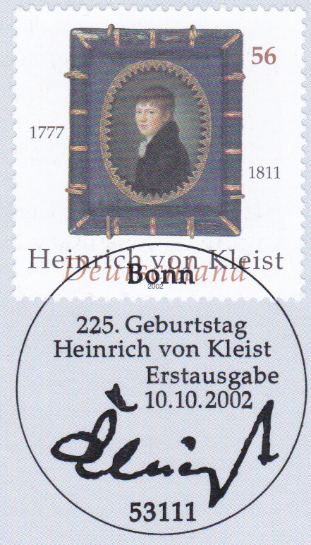 Zu seinem 225. Geburtstag erschien 2002 bei der Deutschen Post diese Sondermarke (MiNr 2283) mir einem Porträt von Heinrich von Kleist nach einem Miniatur von Peter Friedel.