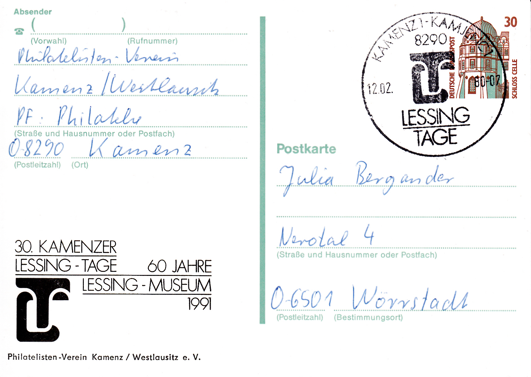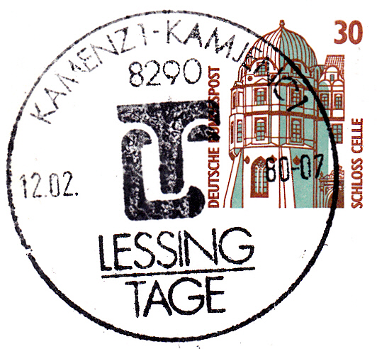 In der Geburtsstadt Kamenz werden seit 1962 regelmäßig "Lessing-Tage" durchgeführt. Zu den 30. Lessing-Tagen wurde 1991 ein Sonderstempel eingesetzt, der hier auf einer Ganzsachen-Postkarte abgeschlagen wurde.