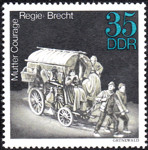 In der Serie "Bedeutende Theaterinszenierungen" erschien in der DDR 1973 eine Marke mit einer Szene aus "Mutter Courage", einem Schauspiel von Bertolt Brecht in einer Inszenierung von Bertolt Brecht und Erich Engel (1891-1966) am Berliner Ensemble.