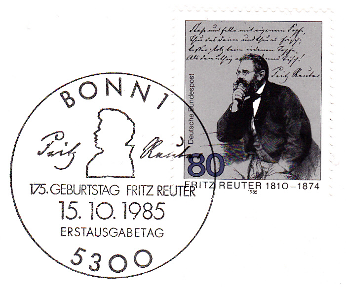 Im Ersttagsonderstempel Bonn ist eine Silhouette von Fritz Reuter und sein Autogramm zu sehen. Hier eine Marke mit diesem Stempel.