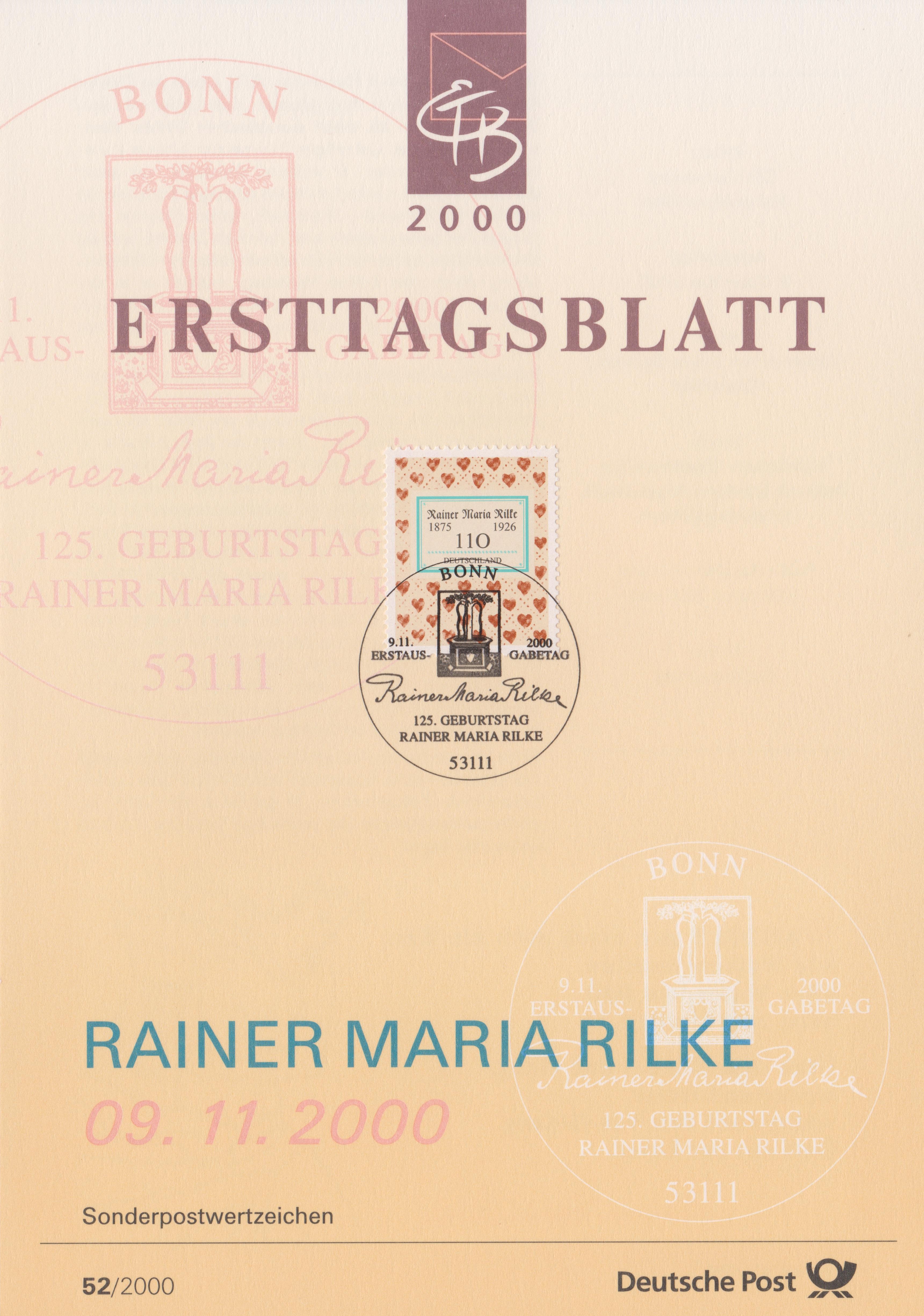 Zum 125. Geburtstag von Rainer Maria Rilke ist bei der Deutschen Post eine Marke (MiNr 2154) mit der Abbildung eines Bucheinbandes erschienen.