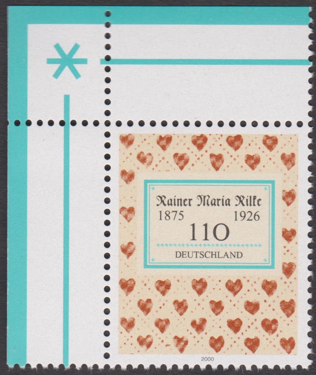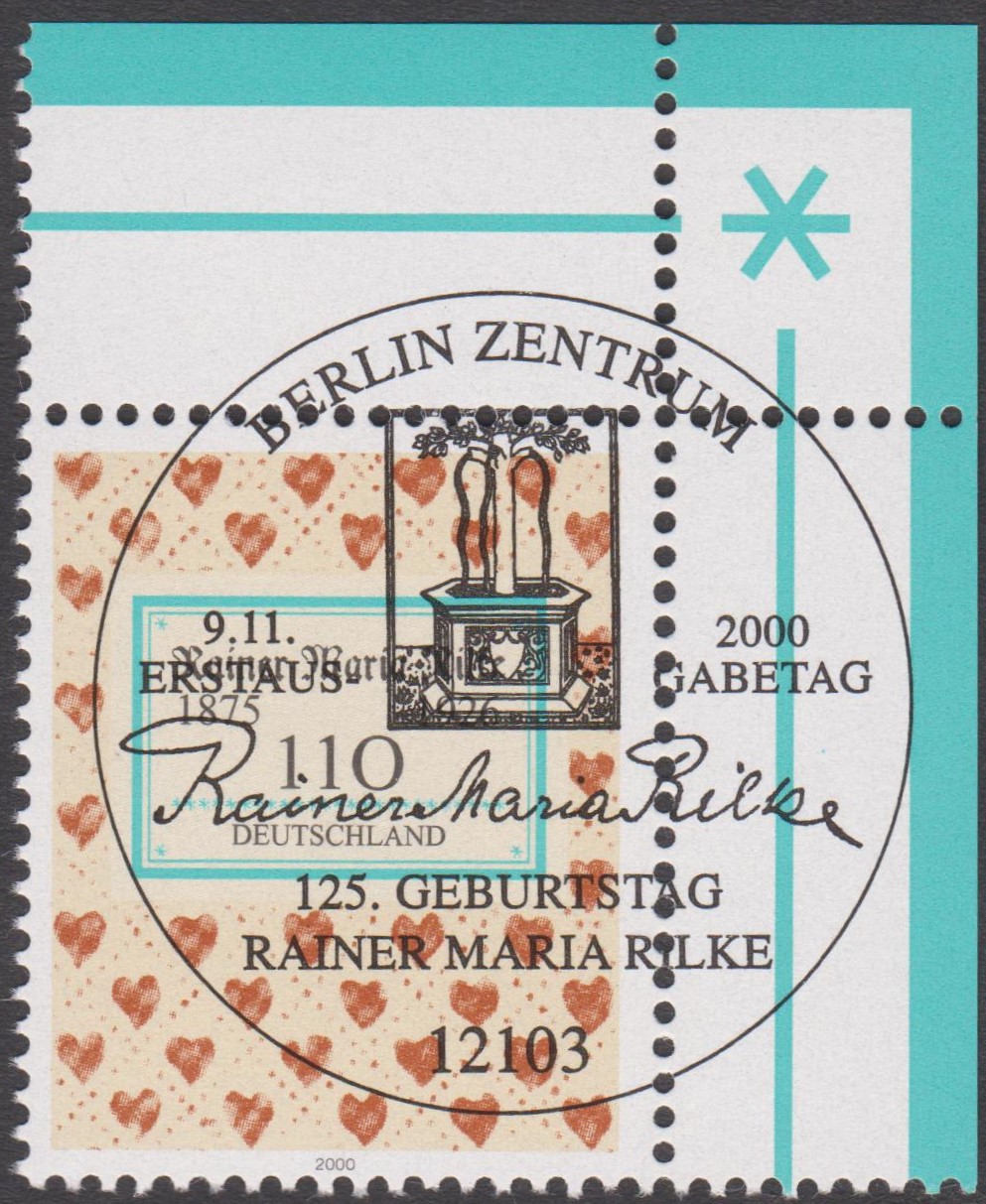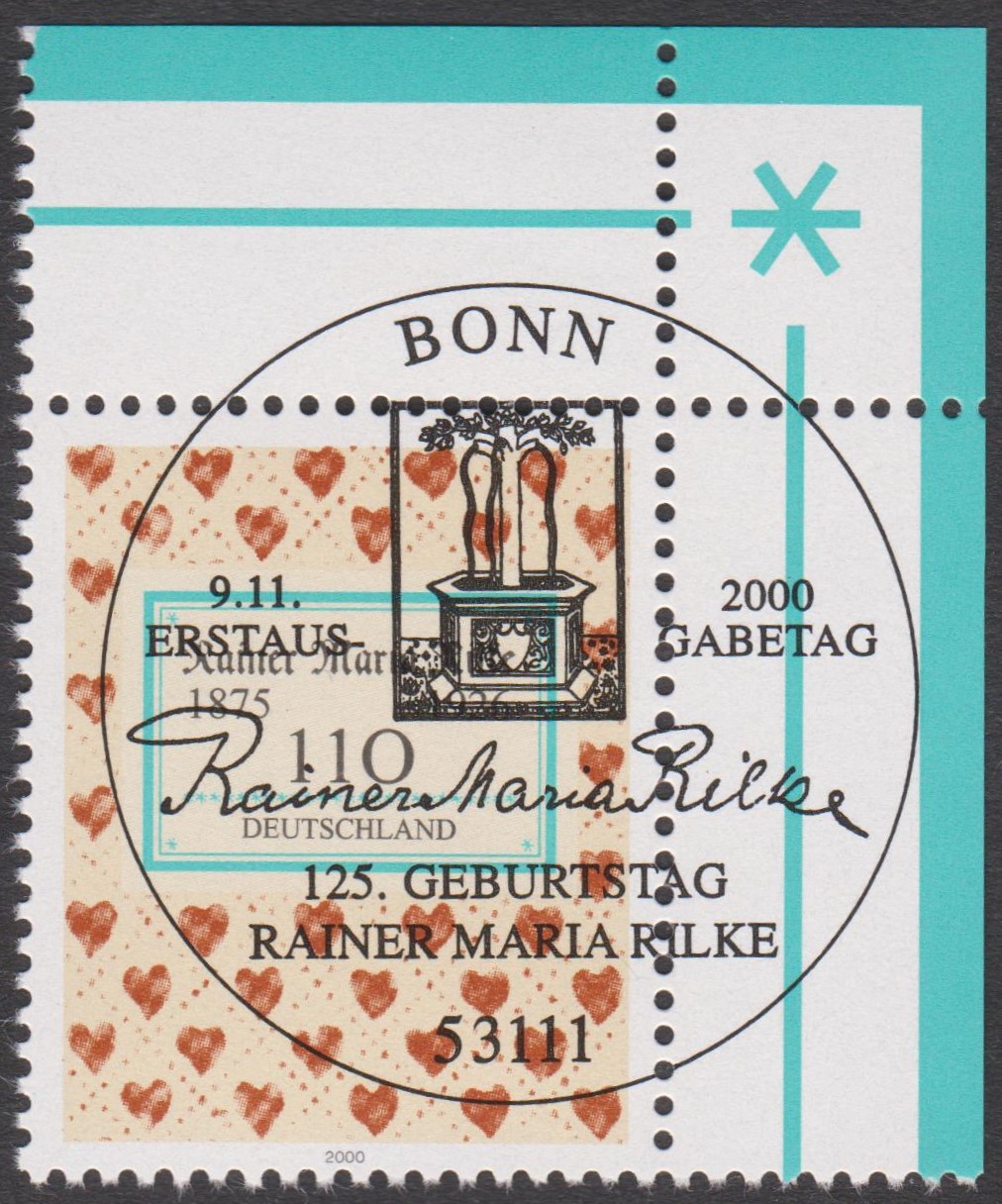 Zum 125. Geburtstag von Rainer Maria Rilke erschien bei der Deutschen Post dieses Postwetzeichen, MiNr. 2154, mit der Abbildung eines Bucheinbandes erschienen, hier als rechte obere Bogenecke des Zehnerbogens (= Feld 5), gestempelt am 09.11.2000 (= Erstausgabetag) in BONN: