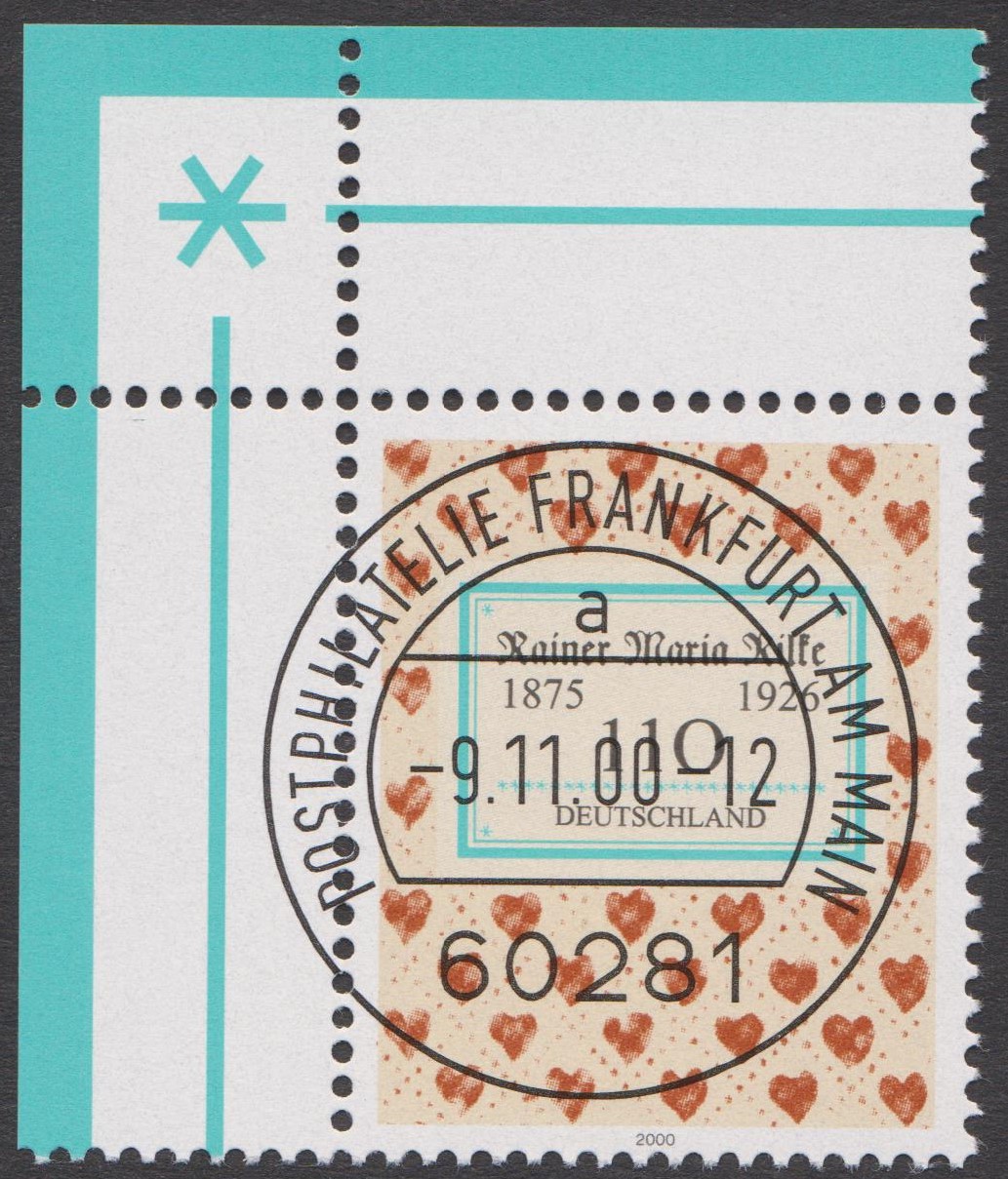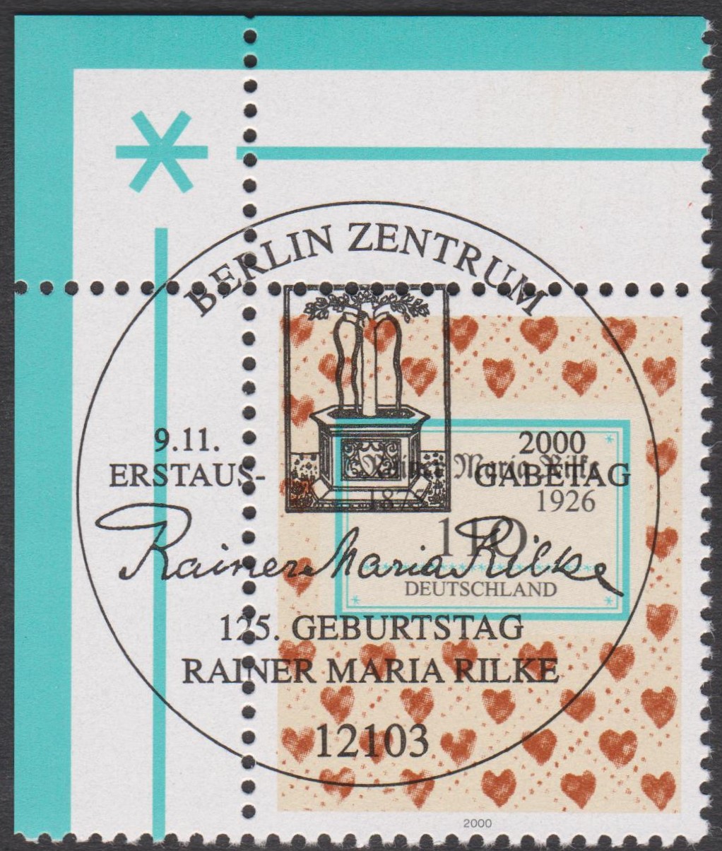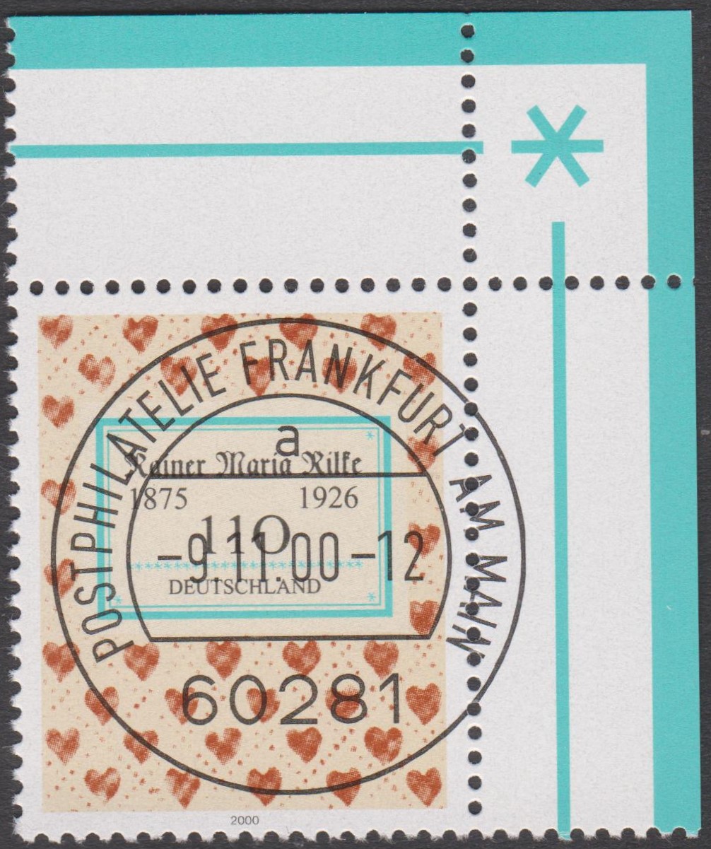 Zum 125. Geburtstag von Rainer Maria Rilke erschien bei der Deutschen Post dieses Postwetzeichen, MiNr. 2154, mit der Abbildung eines Bucheinbandes erschienen, hier als rechte obere Bogenecke des Zehnerbogens (= Feld 5), gestempelt am 09.11.2000 (= Erstausgabetag) in BONN: