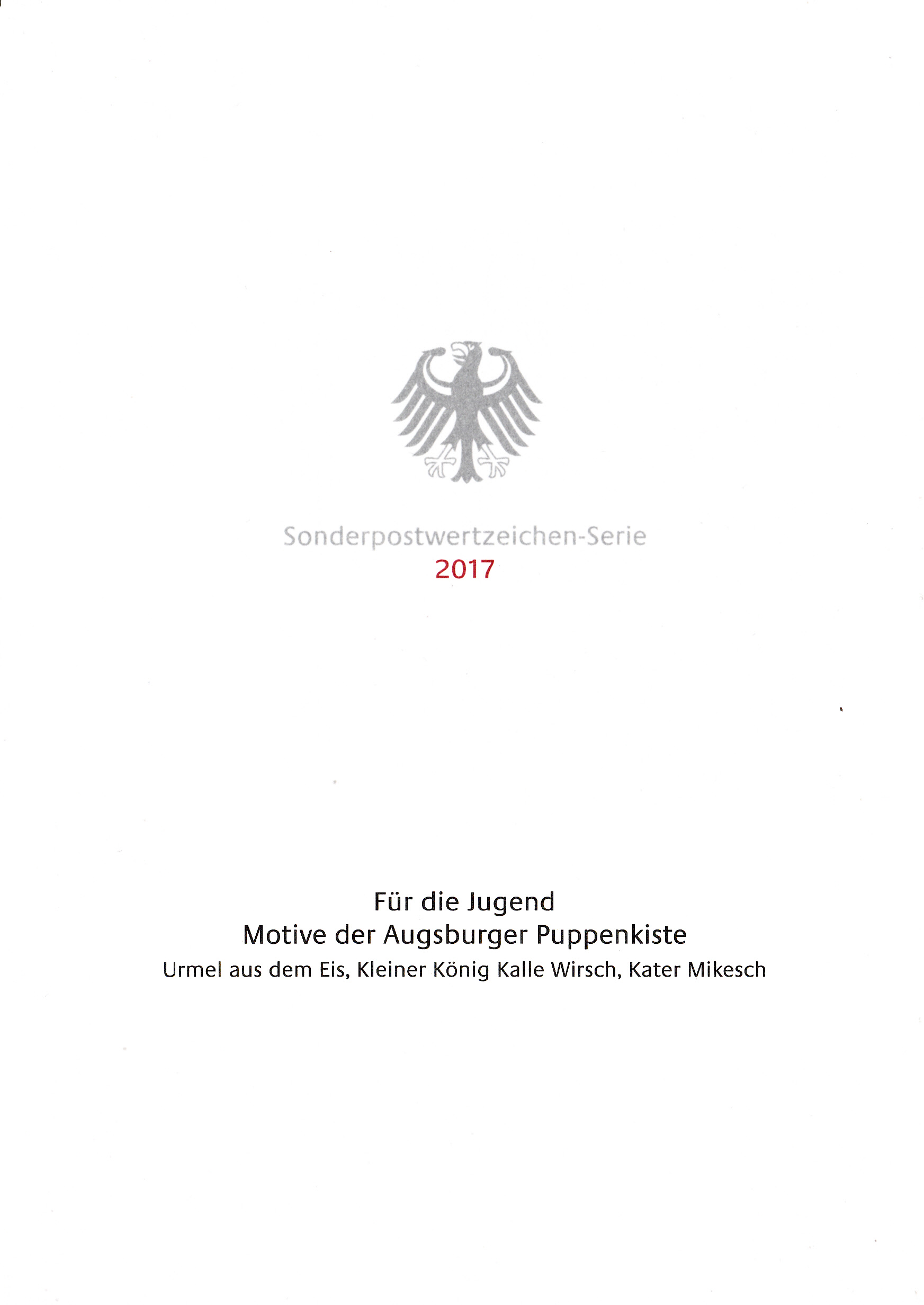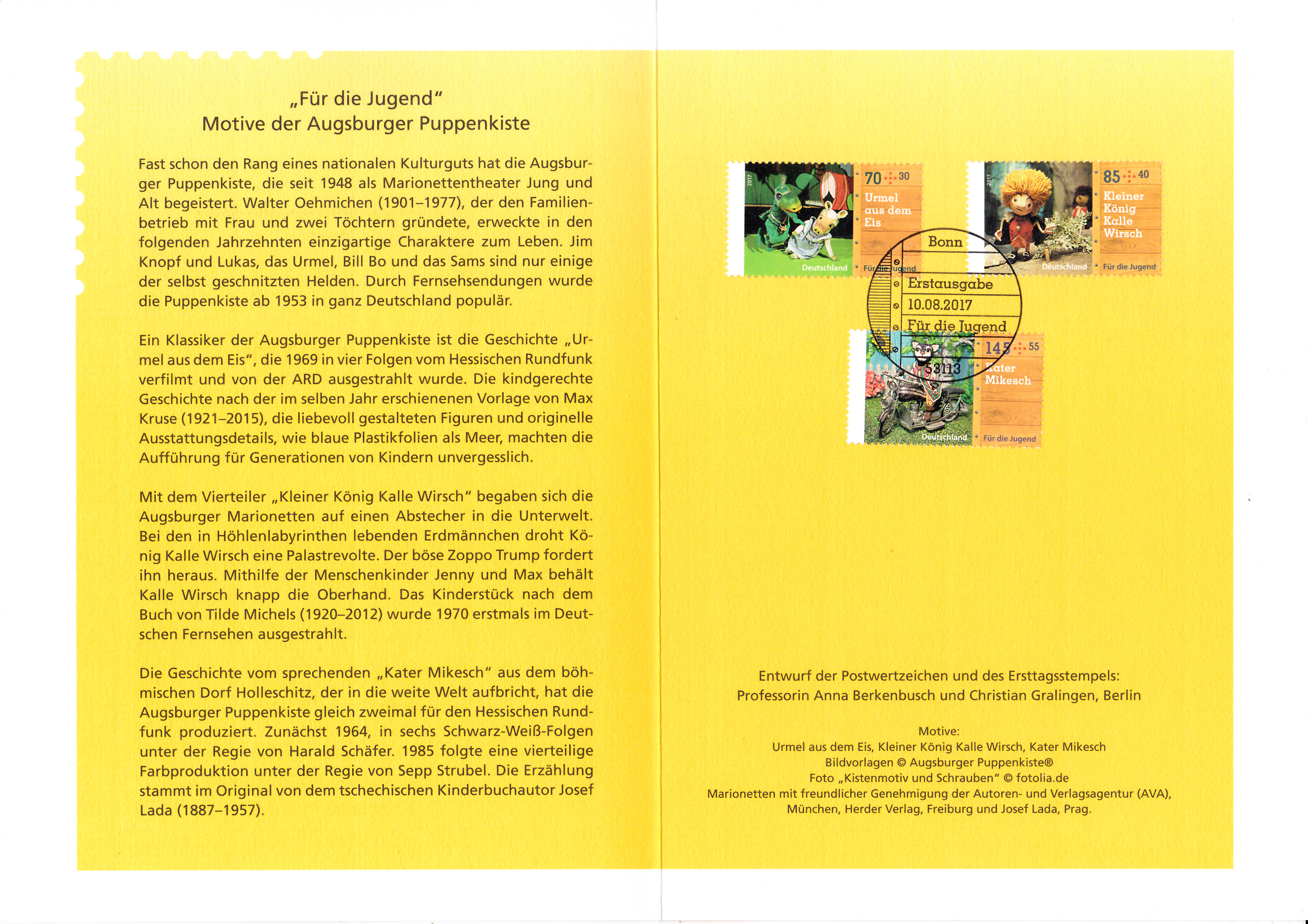 Die Jugendmarken 2017 der Deutschen Post AG zeugen Figuren des Marionettentheaters Augsburger Puppenkiste. Hier die Marke zu 70+30 Cent (MiNr 3325) mit der Abbildung "Urmel aus dem Eis".
