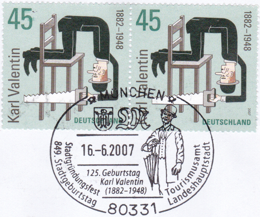 Diese Marke zum 125. Geburtstag von Karl Valentin (MiNr 2610) wurde mit dem Ersttagsonderstempel Bonn gestempekt.