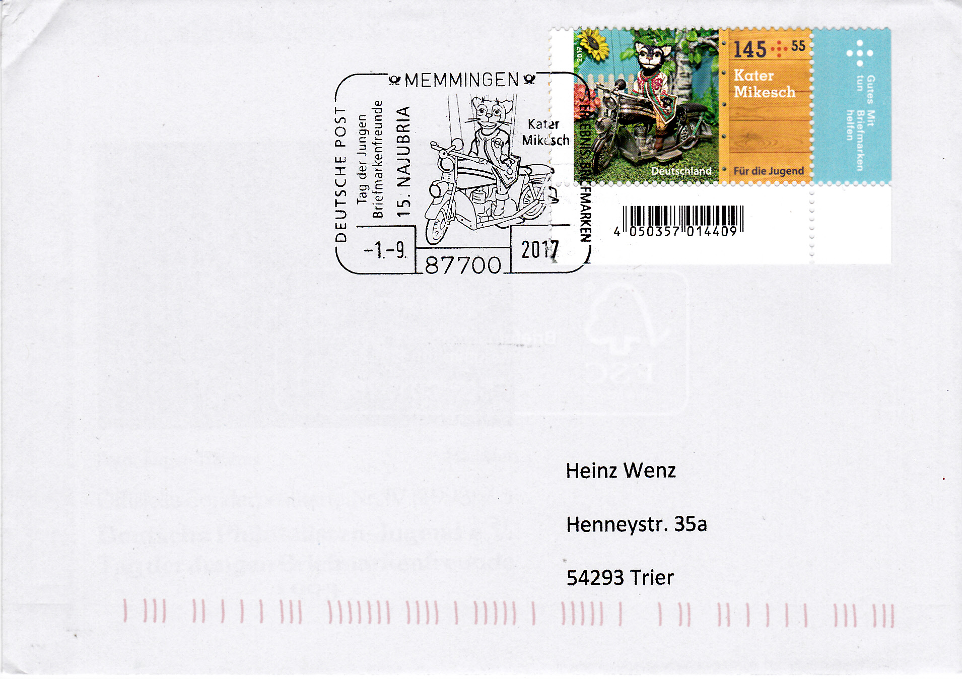 Sonderstempel vom 1.9.2019 aus Memmingen zum Tag der Jungen Briefmarkenfreunde bei der 15. NAJUBRIA mit der Abbildung "Kater Mikesch".