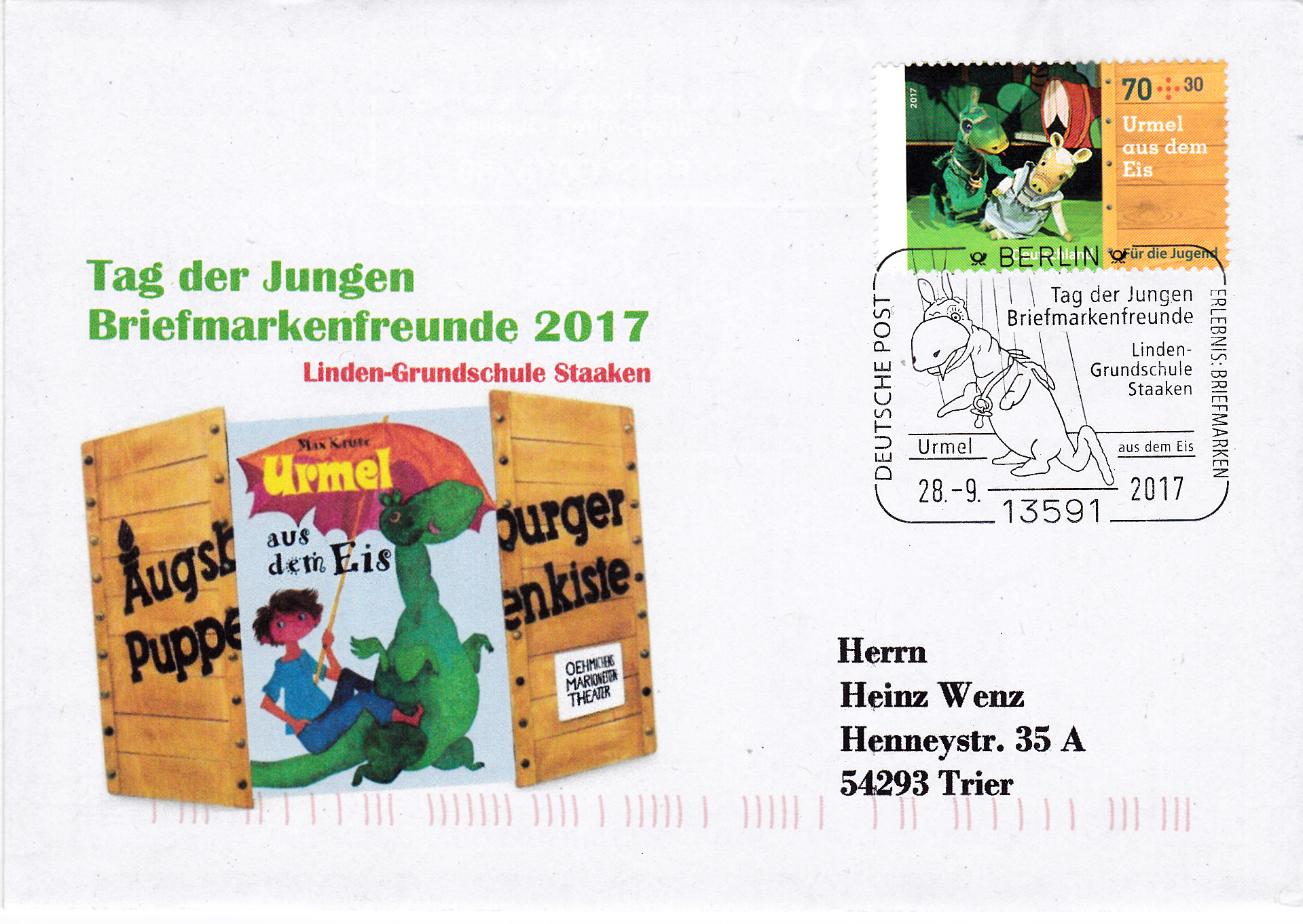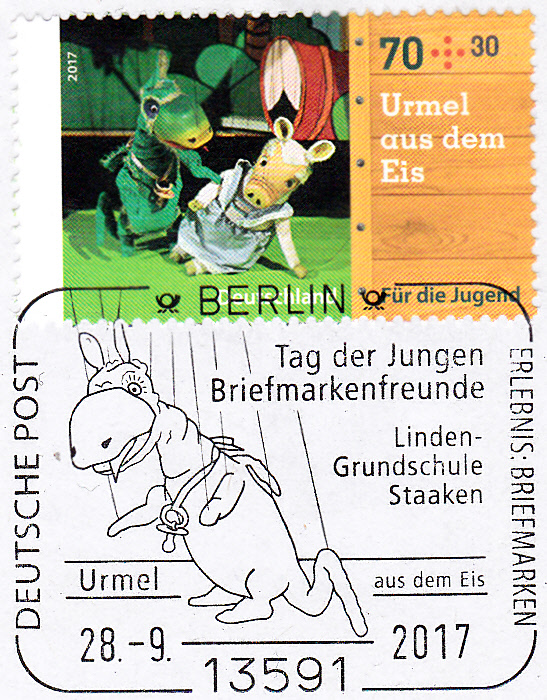 Einen weiteren Sonderstempel mit "Urmel aus dem Eis" gab es am 28.9.2017 in Berlin zu einer Veranstaltung zum Tag der Jungen Briefmarkenfreunde.