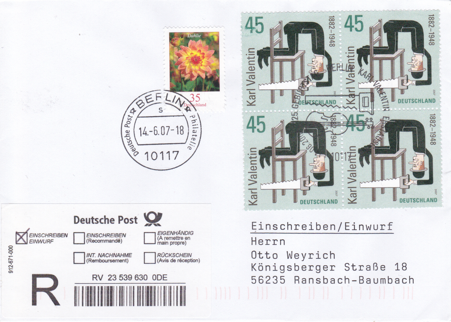 Einwurf-Einschreiben mit einem Viererblock der Marke zum 125. Geburtstag von Karl Valentin (MiNr 2610) und einer Marke der DS "Blumen" zu 35 Cent und mit dem Ersttagsonderstempel vom 14.6.2007 aus Berlin. Die Zusatzfrankatur wurde mit einem Tagesstempel entwertet.
