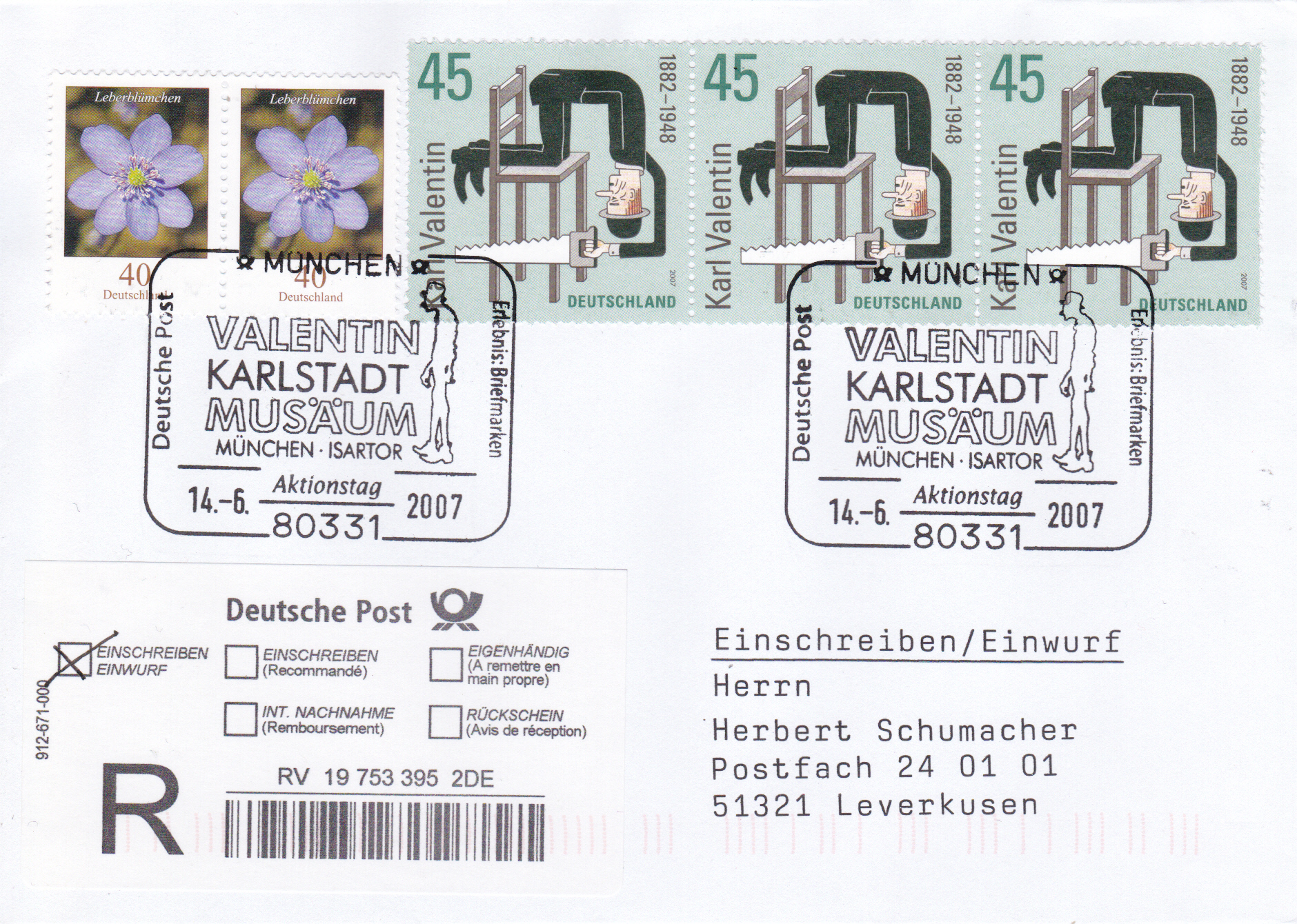 Einwurf-Einschreiben mit drei Marken zum 125. Geburtstag von Karl Valentin (MiNr 2610) und zwei Marke der DS "Blumen" zu 40 Cent und mit dem Sonderstempel vom 14.6.2007 aus München zum Aktionstag zum Ausgabetag der Marke.