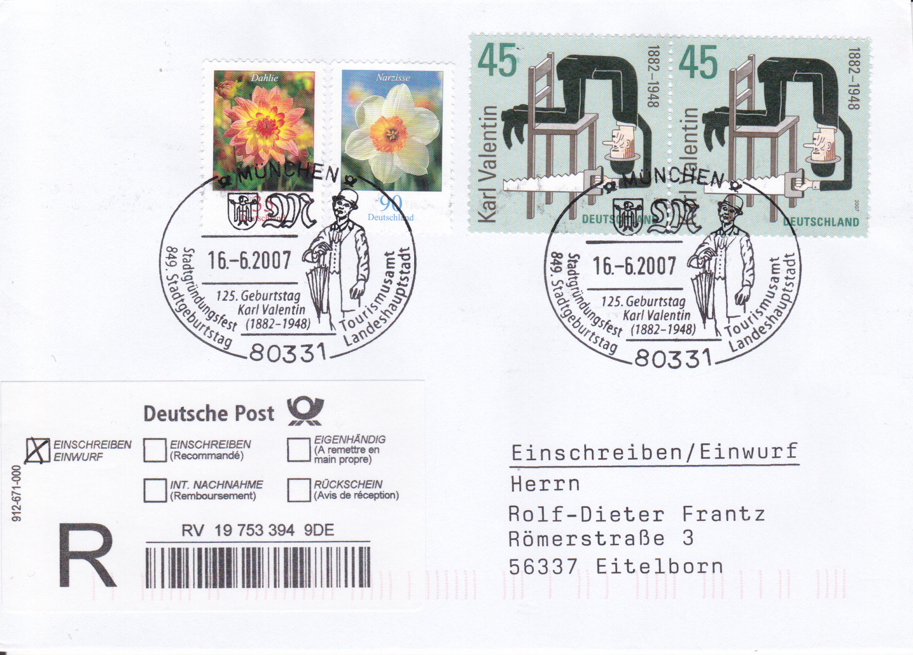 Einwurf-Einschreiben mit zwei Marken zum 125. Geburtstag von Karl Valentin (MiNr 2610) und je einer Marke der DS "Blumen" zu 90 Cent und 35 Cent und mit dem Sonderstempel vom 16.6.2007 aus München zum Stadtgeburtstag von München und dem Geburtstag von Carl Valentin.