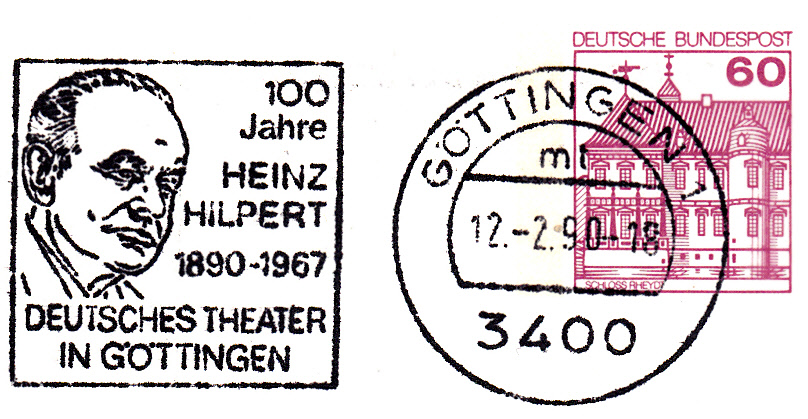 Handwerbestempel vom 12.2.1990 aus Göttingen mit einem Porträt von Heinz Hilpert im Werbeeinsatz.