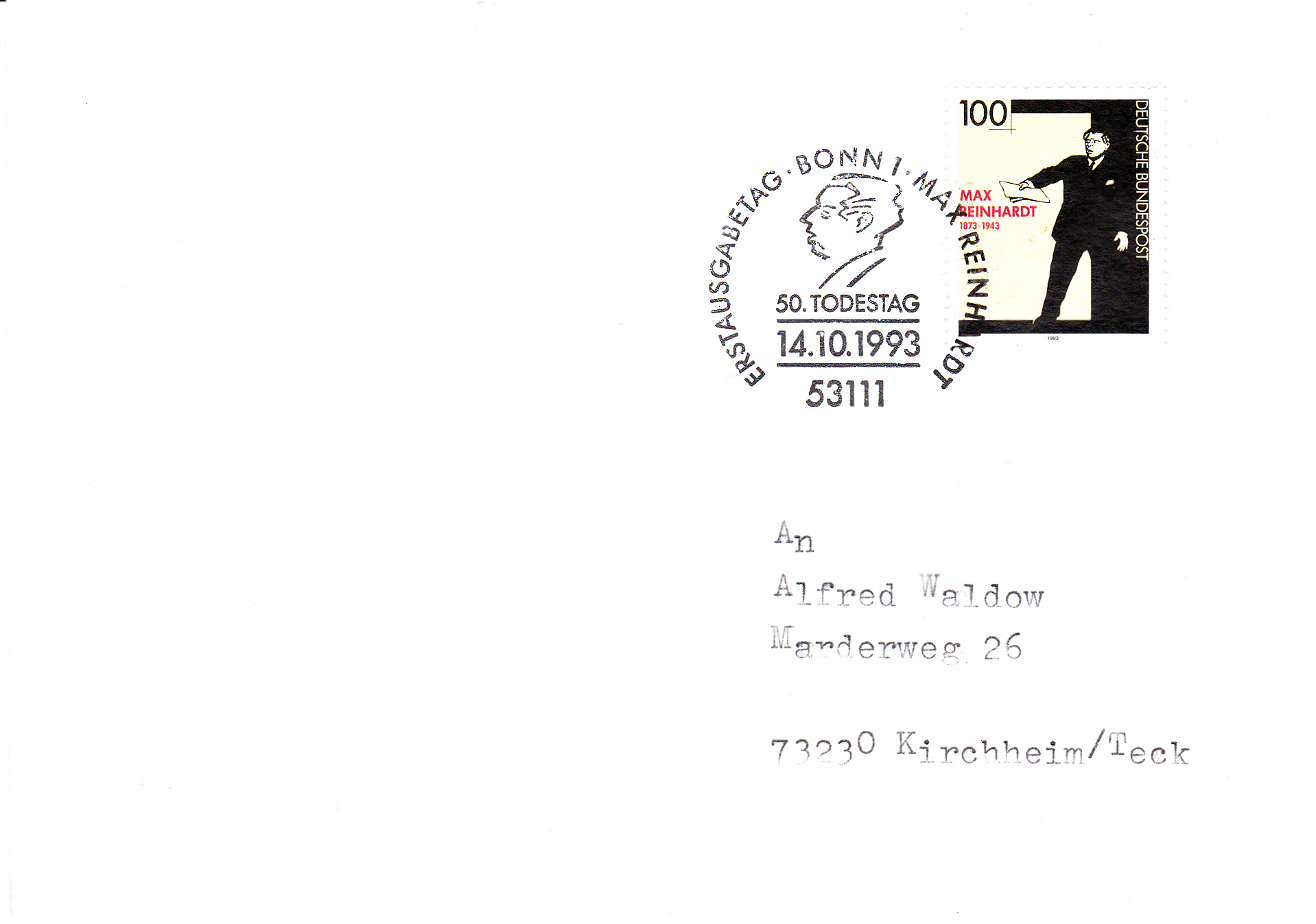 Im Ersttagsonderstempel Bonn ist ein Profilbild von Max Reinhardt zu sehen. Hier zeige ich einen Ersttagsbrief dieser Marke mit dem erwähnten Stempel.