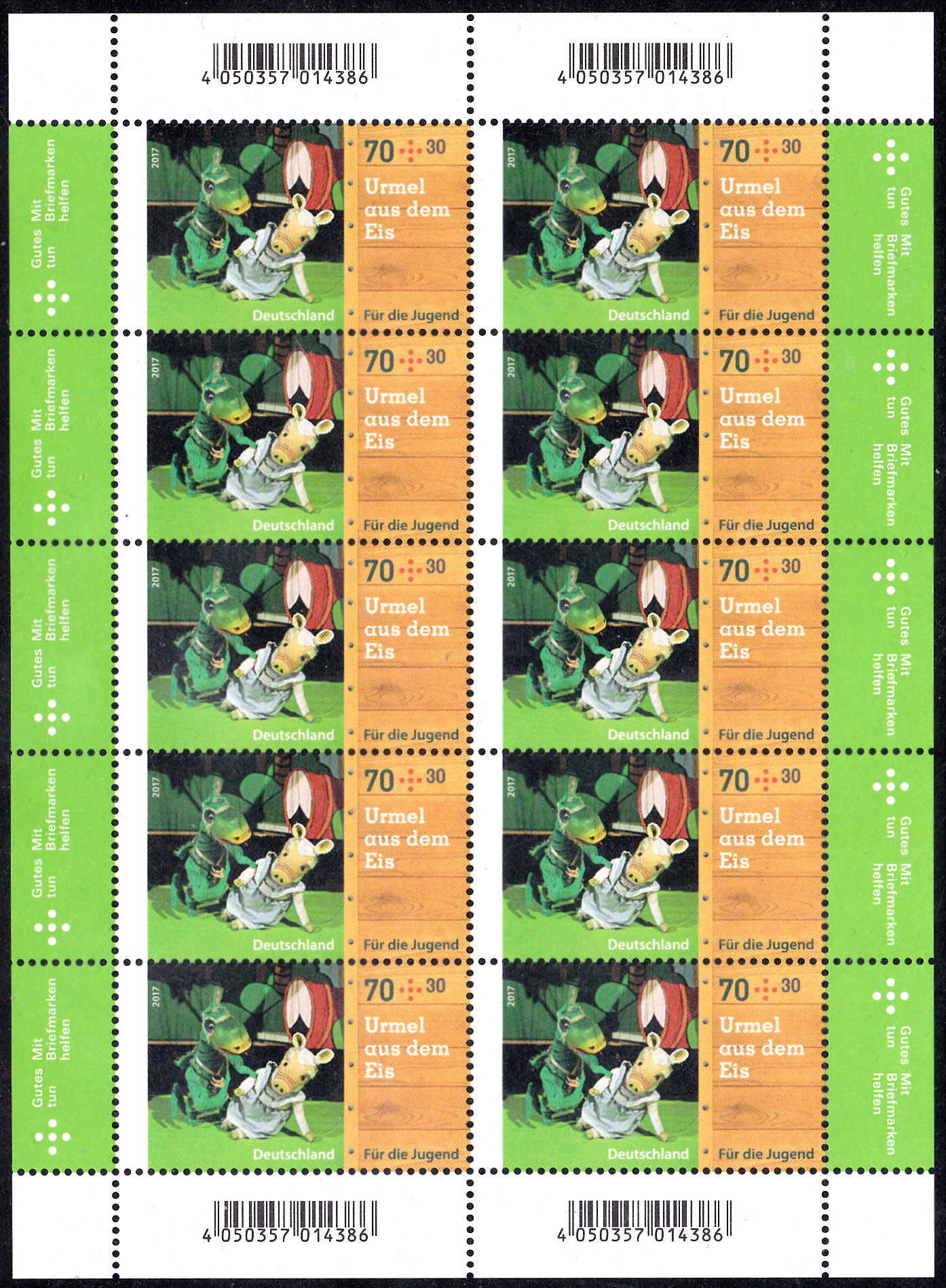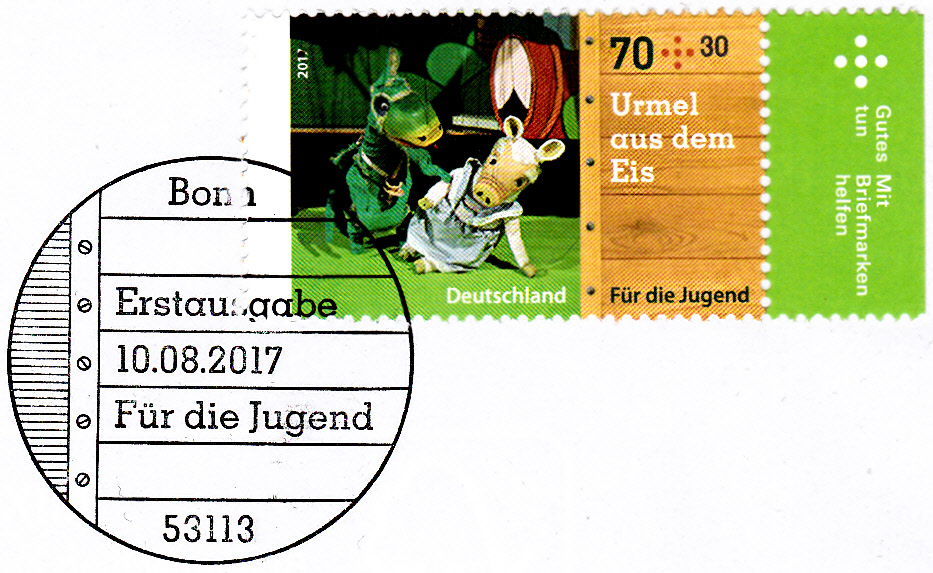 Die Jugendmarken 2017 der Deutschen Post AG zeugen Figuren des Marionettentheaters Augsburger Puppenkiste. Hier die Marke zu 70+30 Cent (MiNr 3325) mit der Abbildung "Urmel aus dem Eis".