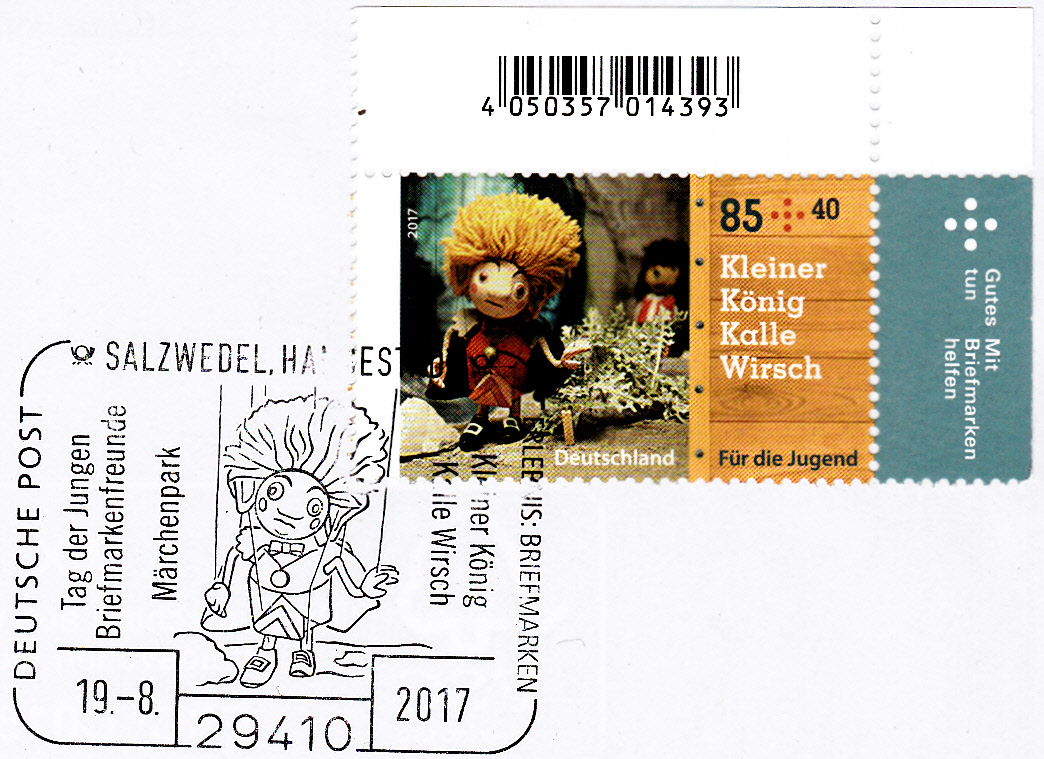 Sonderstempel vom 19.8.2017 aus Salzwedel zum Tag der Jungen Briefmarkenfreunde mit der Darstellung "Kleiner König Kalle Wirsch", motivpassend zur Jugendmarke zur 85+40 Cent-Marke.