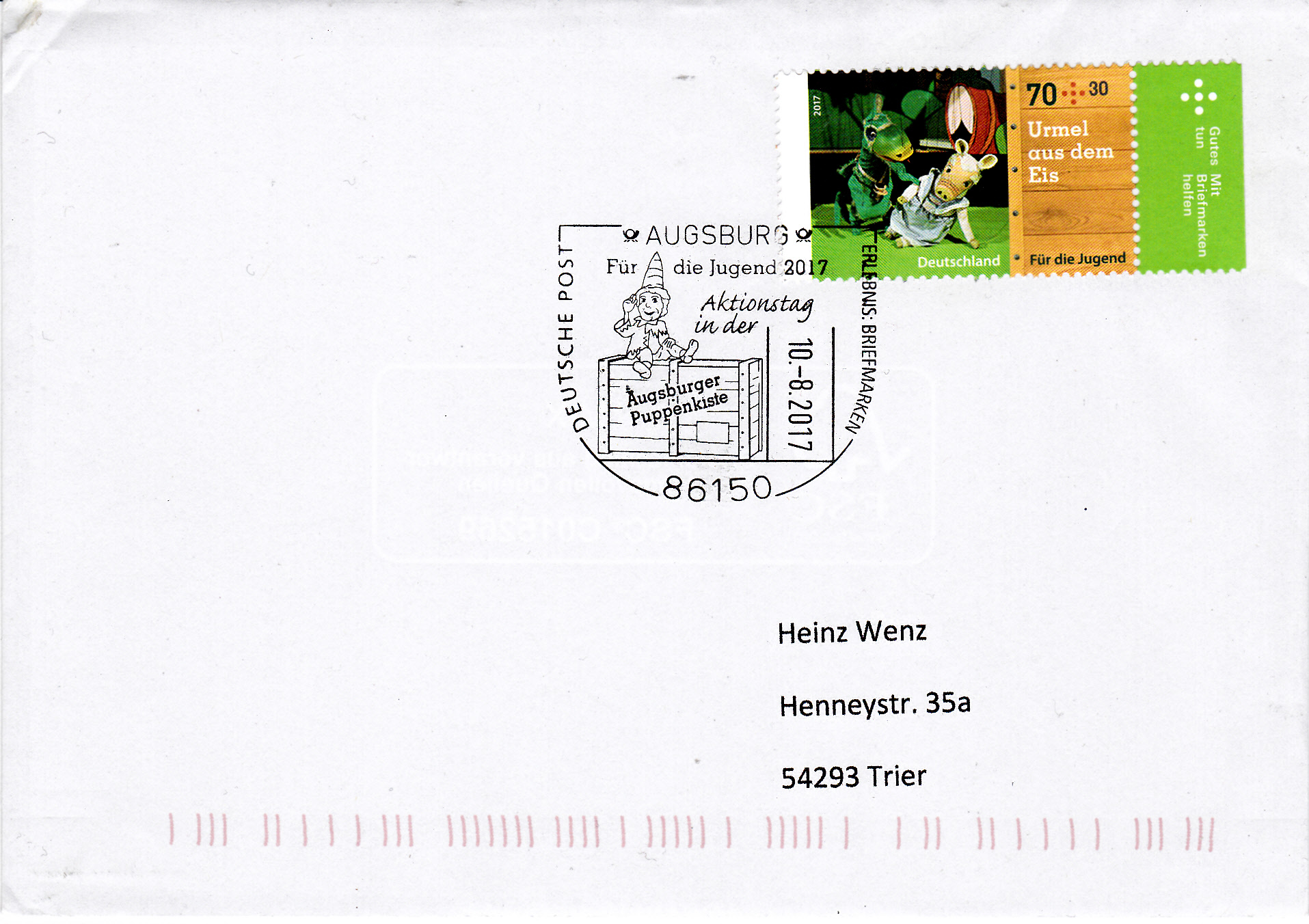 Sonderstempel vom Ersttag (10.8.2017) aus Augsburg zu einem Aktionstag des EB-Teams in den Räumen der Augsburger Puppenkiste. Im Stempelbild ein Kasper auf einer Puppenkiste gezeigt.