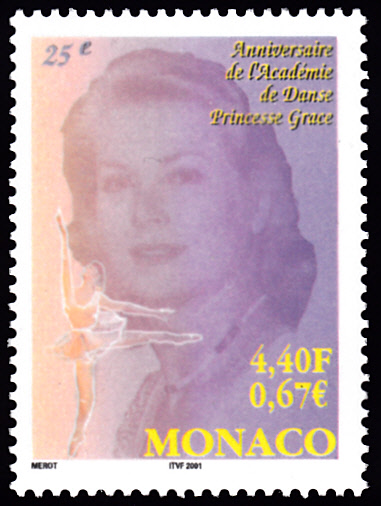 Zum Jubiläum "25 Jahre Akademie für Tanz Princesse Grace" erschien in Monaco eine Marke (MiNr 2556) mit einem Porträt von Fürstin Gracia Patricia (1929-1982) und einer Ballettänzerin.