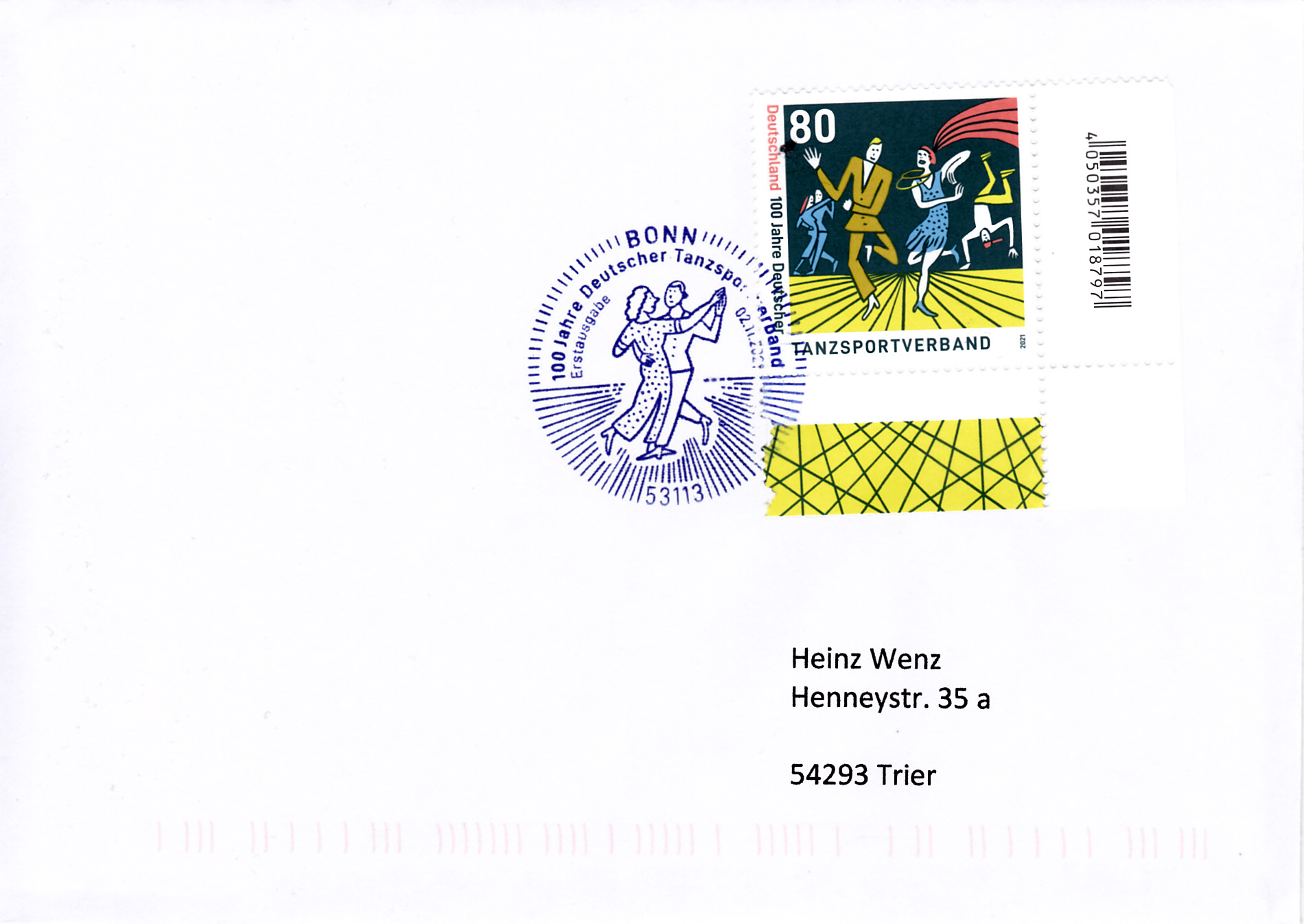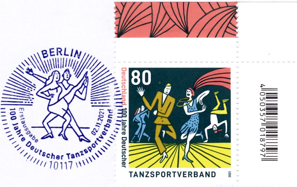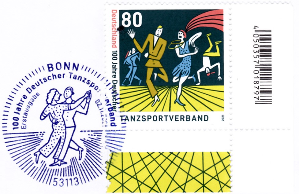 Zum Jubiläum "100 Jahre Deutscher Tanzsportverband" erschien bei der Deutschen Post eine Marke (MiNr 3639). Das Markenbild zeigt Tango-, Rock ’n’ Roll- und Break-Tänzer.