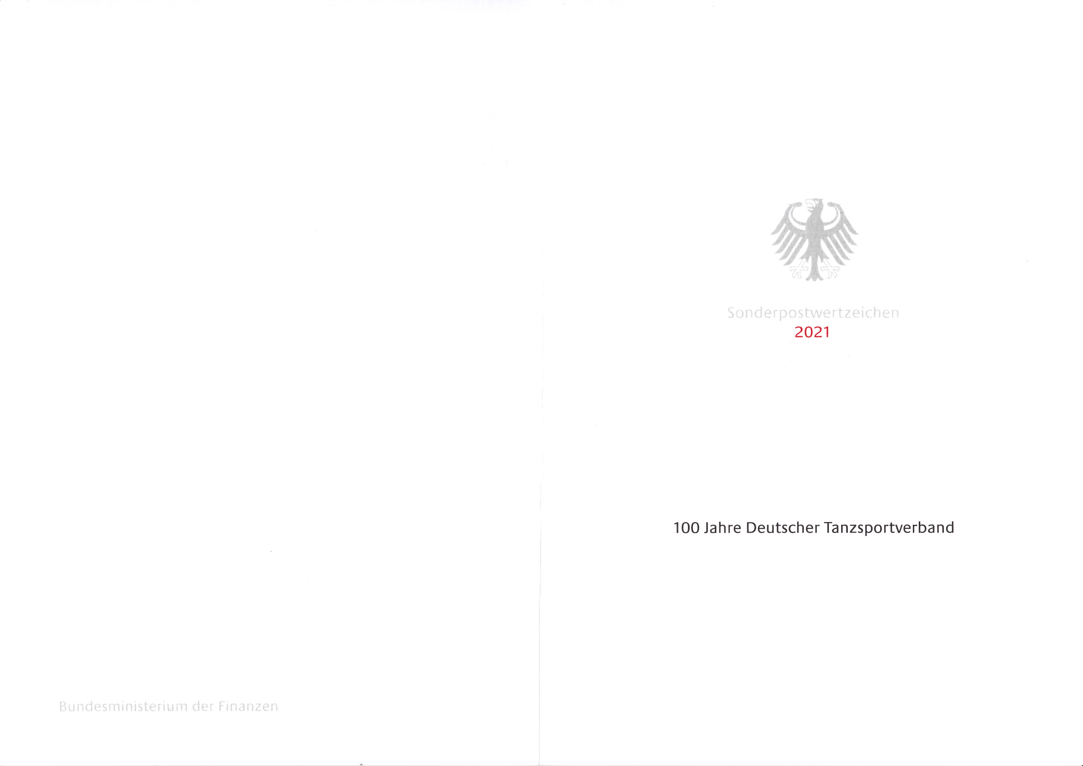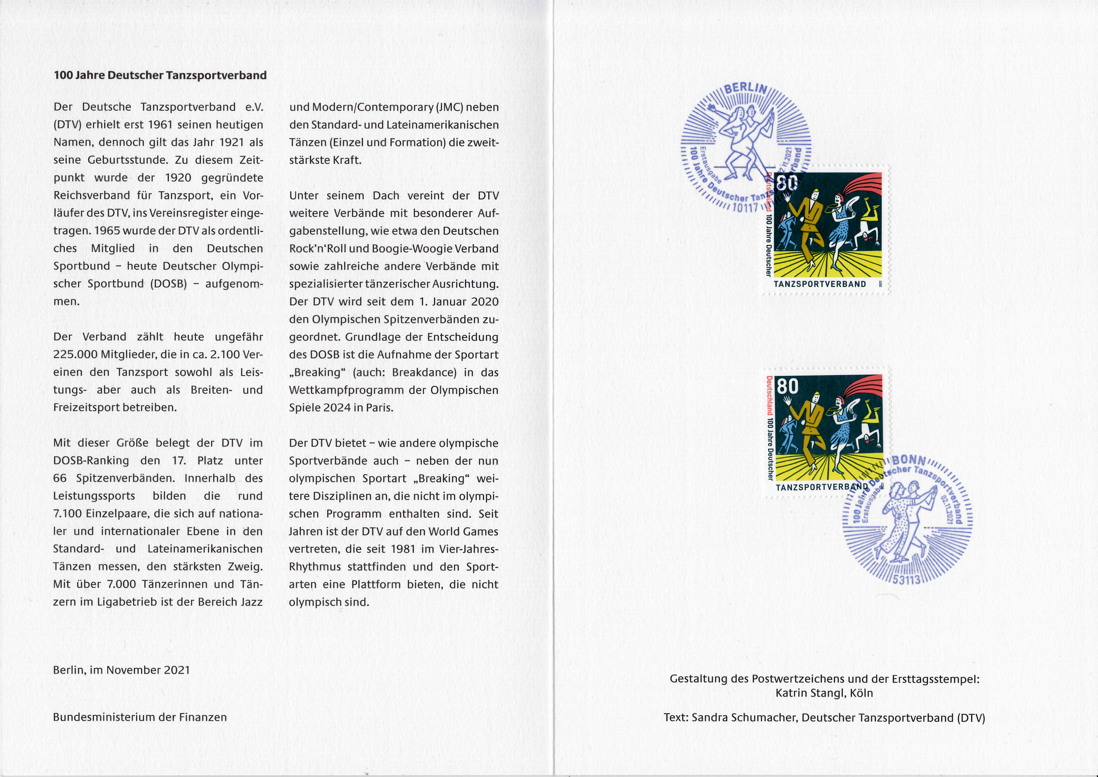 Ministerkarte des Bundesministers für Finanzen mit zwei Marken der Deutschen Post (MiNr 3639) "100 Jahre Deutscher Tanzsportverband" und den beiden Ersttagsonderstempel Bonn und Berlin. Wegen der Bundestagswahl am 26.9.2021 gab es am Tag der Ausgabe der Marken im November nur einen "geschäftsführenden" Finanzminister. Die Ministerkarten tragen daher keine Unterschrift des Ministers.