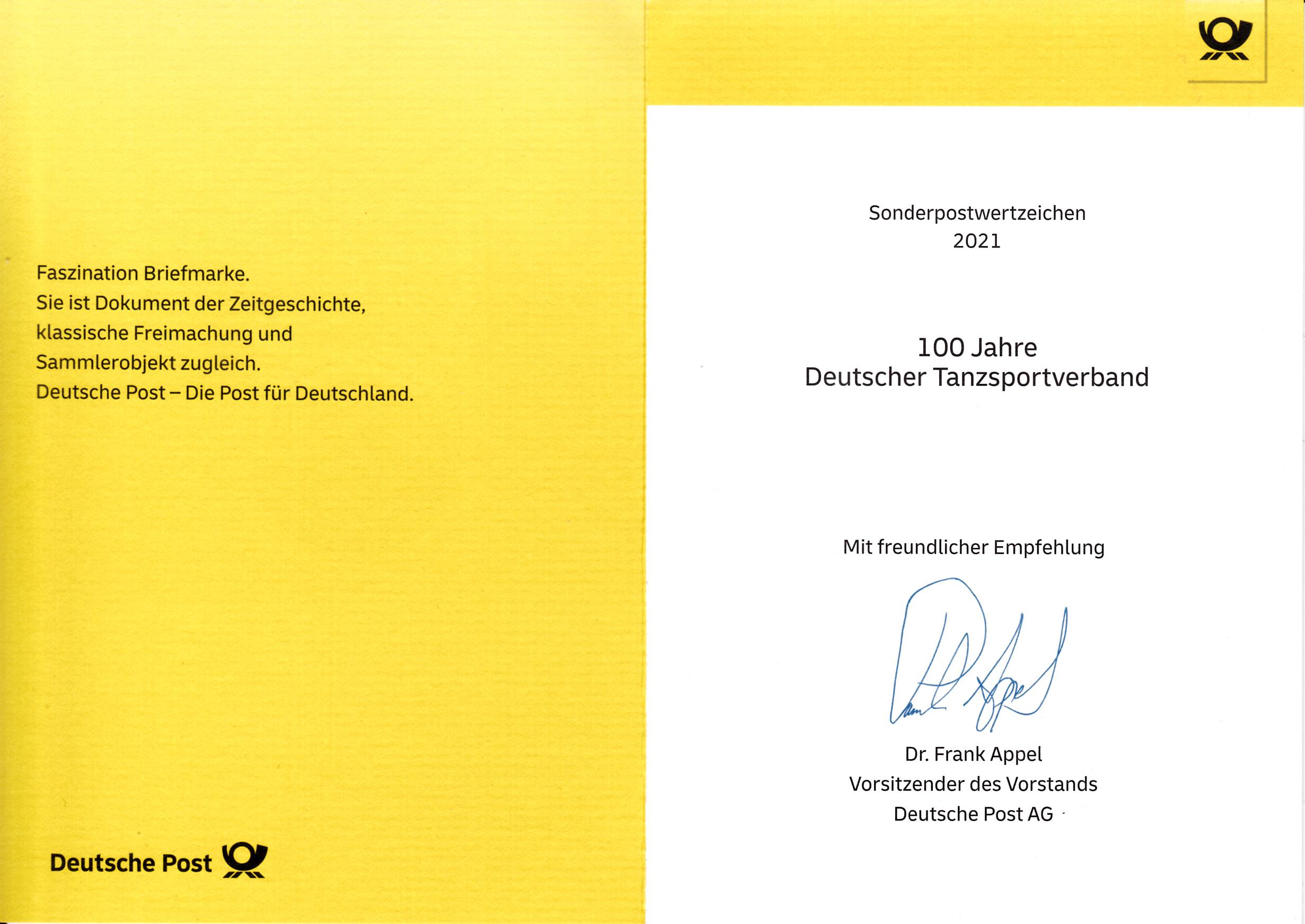 Klappkarte des Vorstandsvorsitzenden der Deutschen Post AG mit der Marke der Deutschen Post (MiNr 3639) "100 Jahre Deutscher Tanzsportverband" und dem Ersttagsonderstempel Bonn.