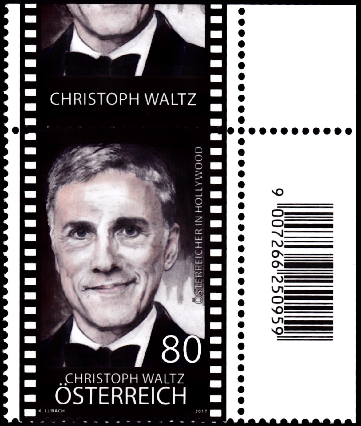 In der Reihe "Österreicher in Hollywood" ist 2017 in Österreich diese Marke (MiNr 3349) mit einem Porträt von Christoph Waltz erschienen. Hier ein Eckrandstück mit EAN-Codierung.