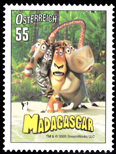 In Österreich ist zur Erstaufführung des Trickfilms "Madagascar" am 7. Juli eine Marke (MiNr 2536) erschienen. Sie zeigt die Hauptfiguren des Filmes: Giraffe Melman, Zebra Marty, Löwe Alex und Flusspferd Gloria.