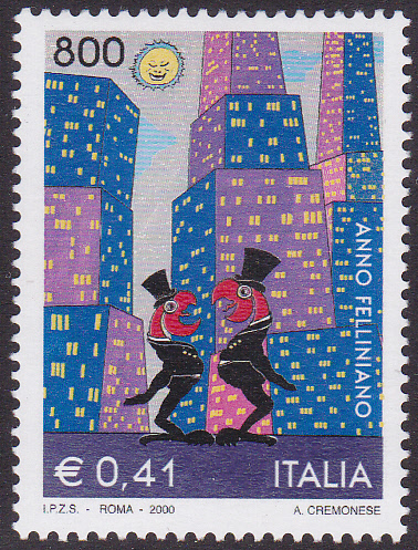 Zum 80. Geburtstag von Federico Fellini erschien in Italien eine Marke (MiNr 2721). Im Markenbild wird das Gemälde "Zwei Hähne im Frack" von Antonio Cremonese in Anlehnung an den Film "Ginger und Fred" von Federico Fellini abgebildet.