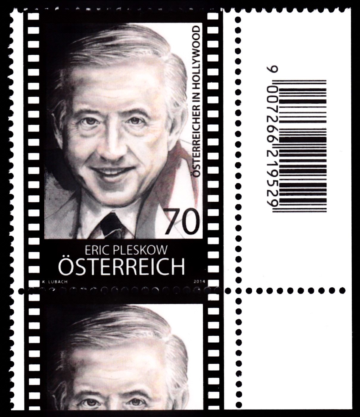 In der Reihe "Österreicher in Hollywood" ist 2014 in Österreich diese Marke (MiNr 3131) mit einem Porträt von Eric Pleskow erschienen. Hier ein Eckrandstück mit EAN-Codierung.