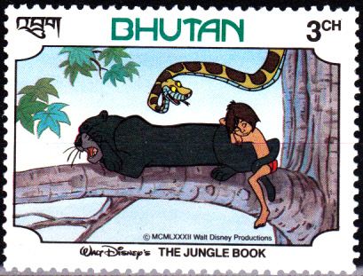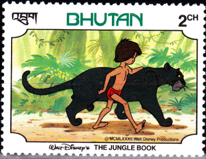 In Bhutan erschien diese Marke (MiNr 781) mit dem Motiv "Der Wolf Rama nimmt sich Mogli an"