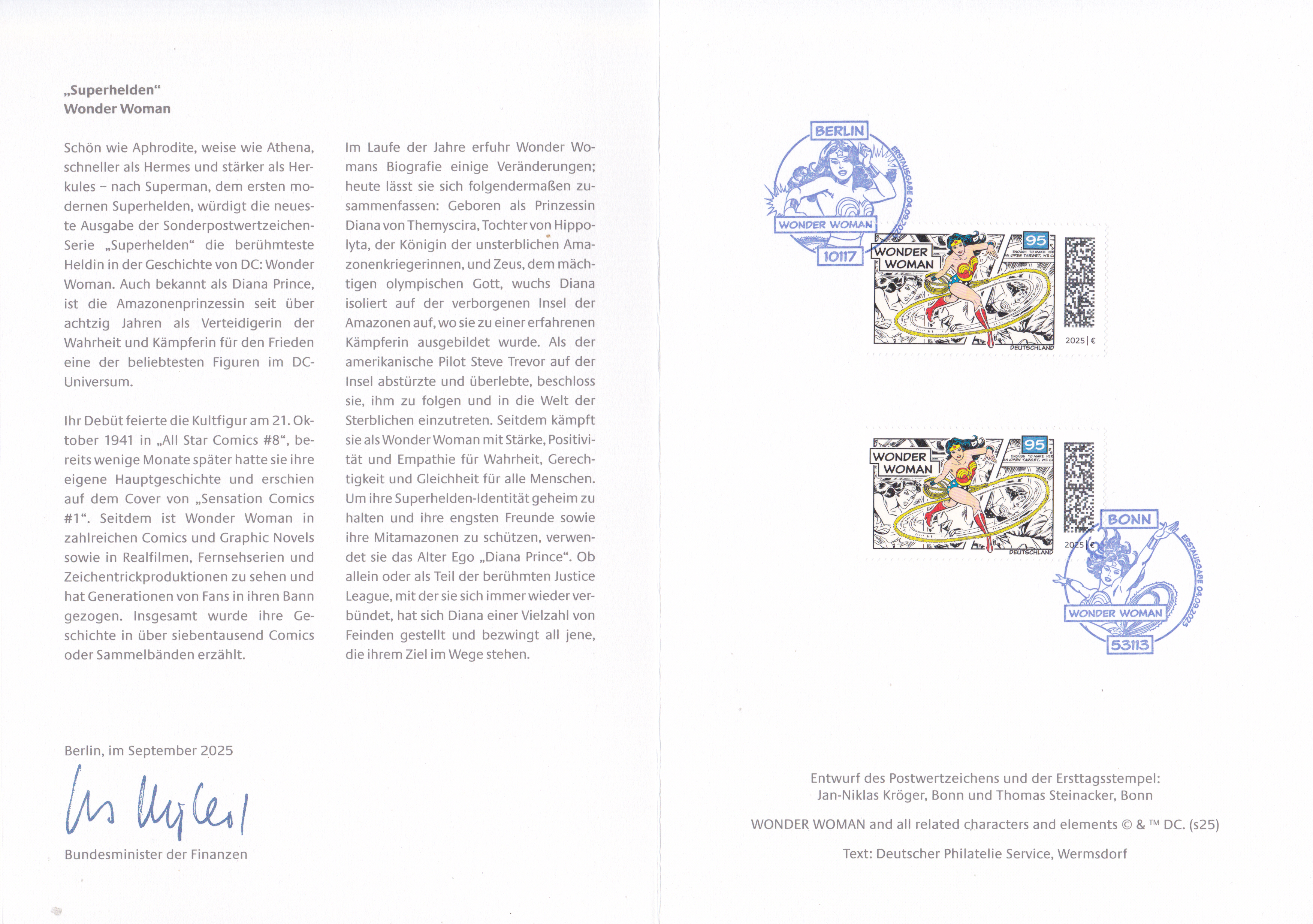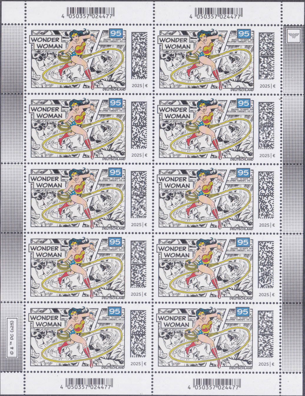 Bei der Deutschen Post ist eine Marke (MiNr 3925) mit der Abbildung Wonder Woman (Diana Prince, eigentlich Diana von Themyscira, Amazonenprinzessin) mit Lasso erschienen. Hier zeige ich eine Marke vom Eckrand mit EAN-Codierung.
