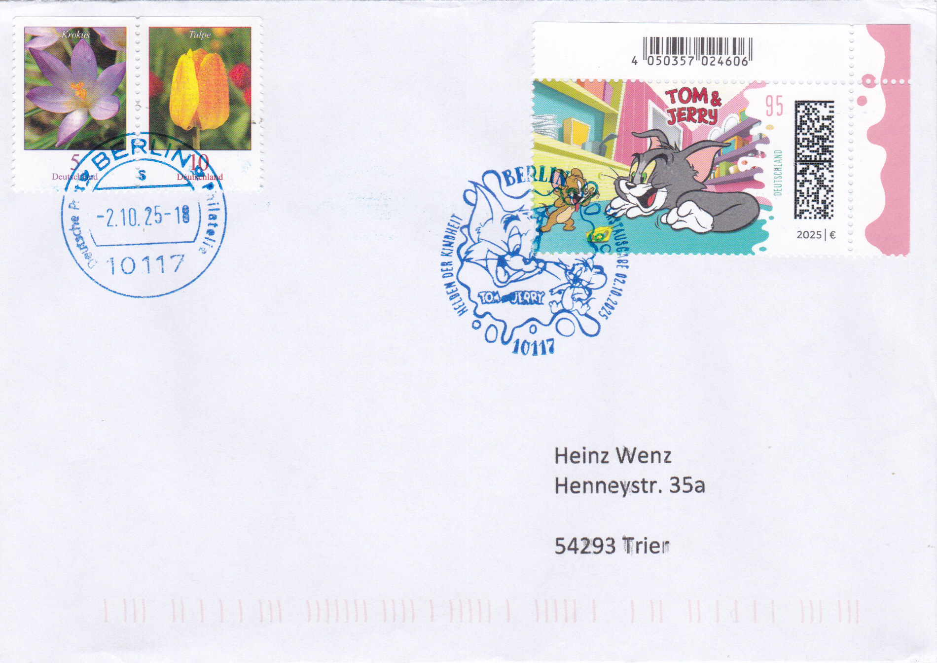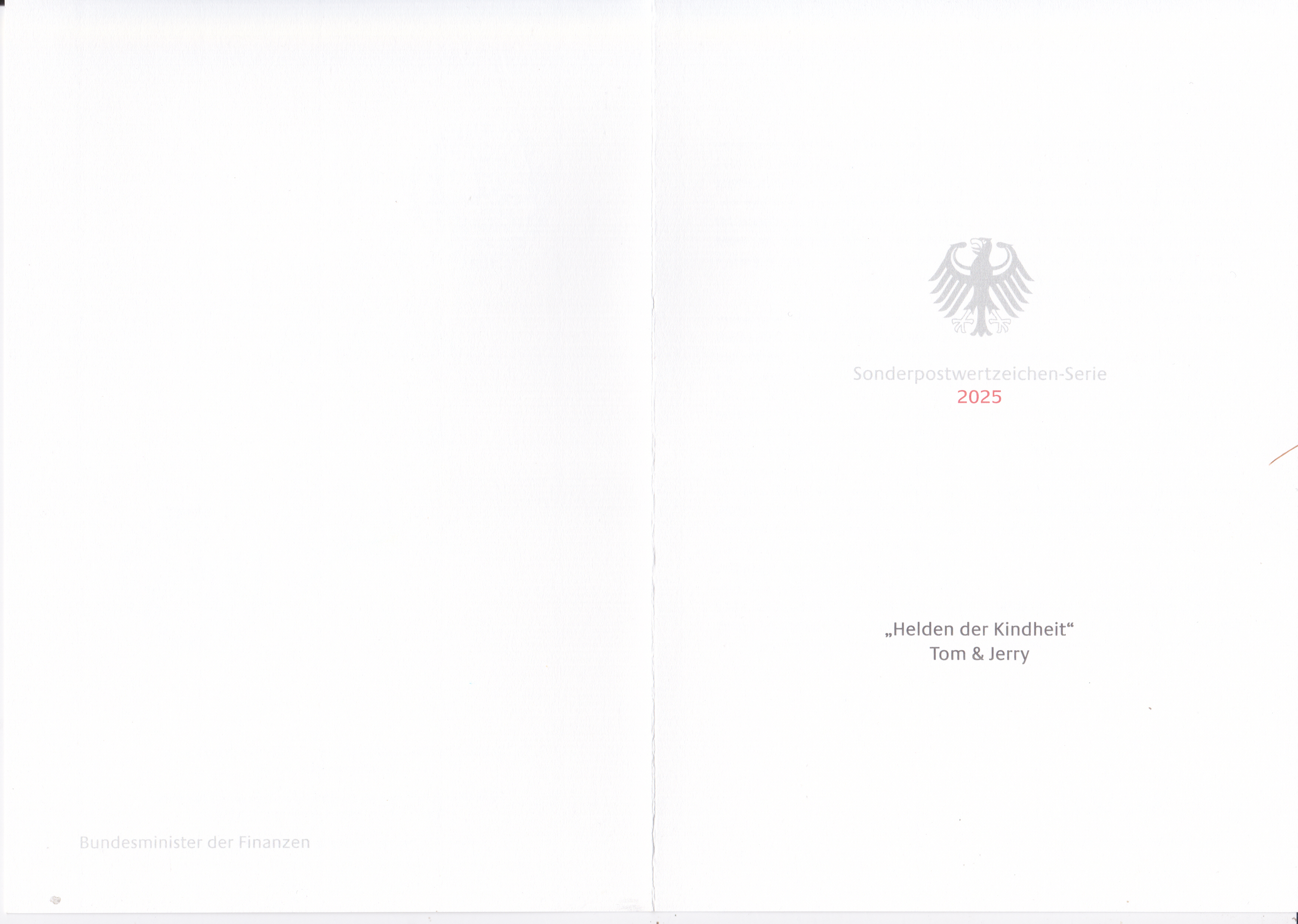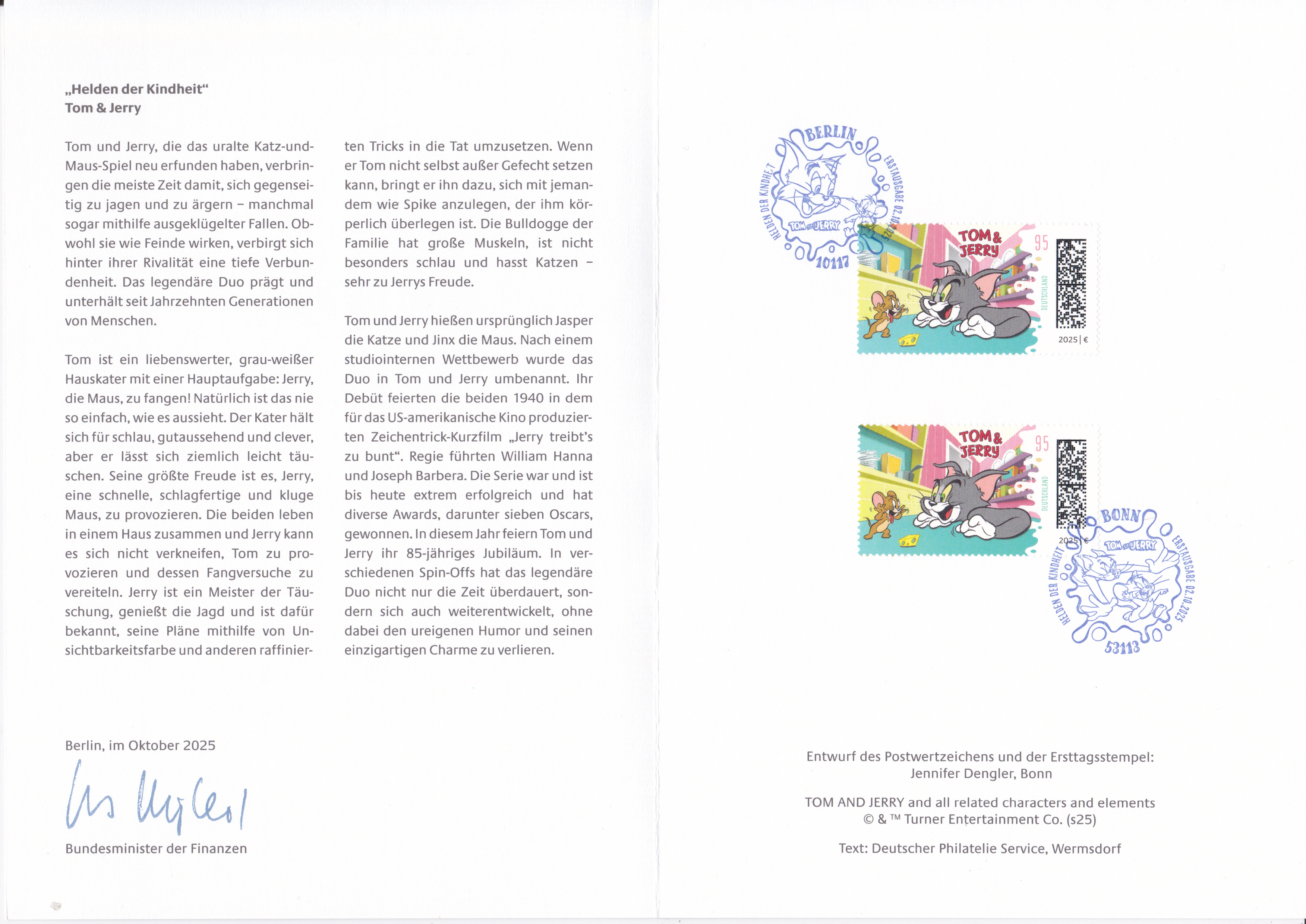 Ministerkarte des Bundesministers für Finanzen mit zwei Marken aus der Serie "Helden der Kindheit" mit dem Motiv "Tom & Jerry" (MiNr 3929) mit den beiden Ersttagsonderstempel Bonn und Berlin.