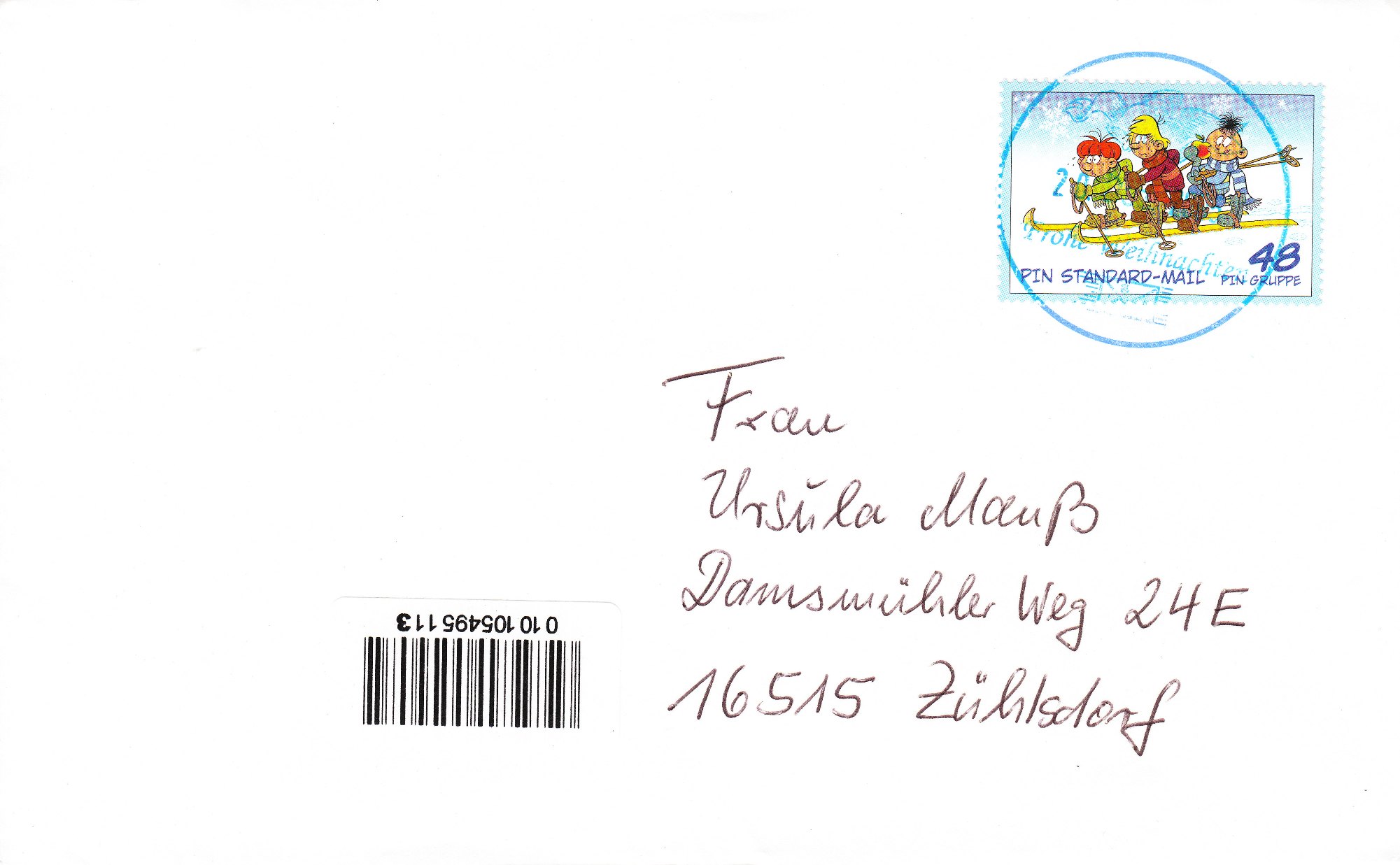 Hier ein Beleg vom 20.12.2005 mit einer EF des am 12.11.2005 von PIN Mail Berlin ausgegebenen Wertes zu 0,48 €, MiNr. 110, mit dem Motiv Abrafaxe: