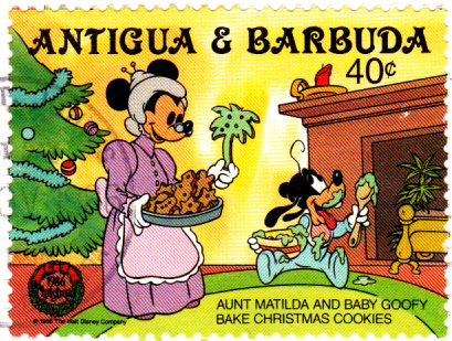 Die Marke MiNr 997 aus der Serie zu Weihnachten 1986 aus Antigua und Barbuda zeigt uns, wie Tante Mathilda und Goofy als Baby Plätzchen backen.