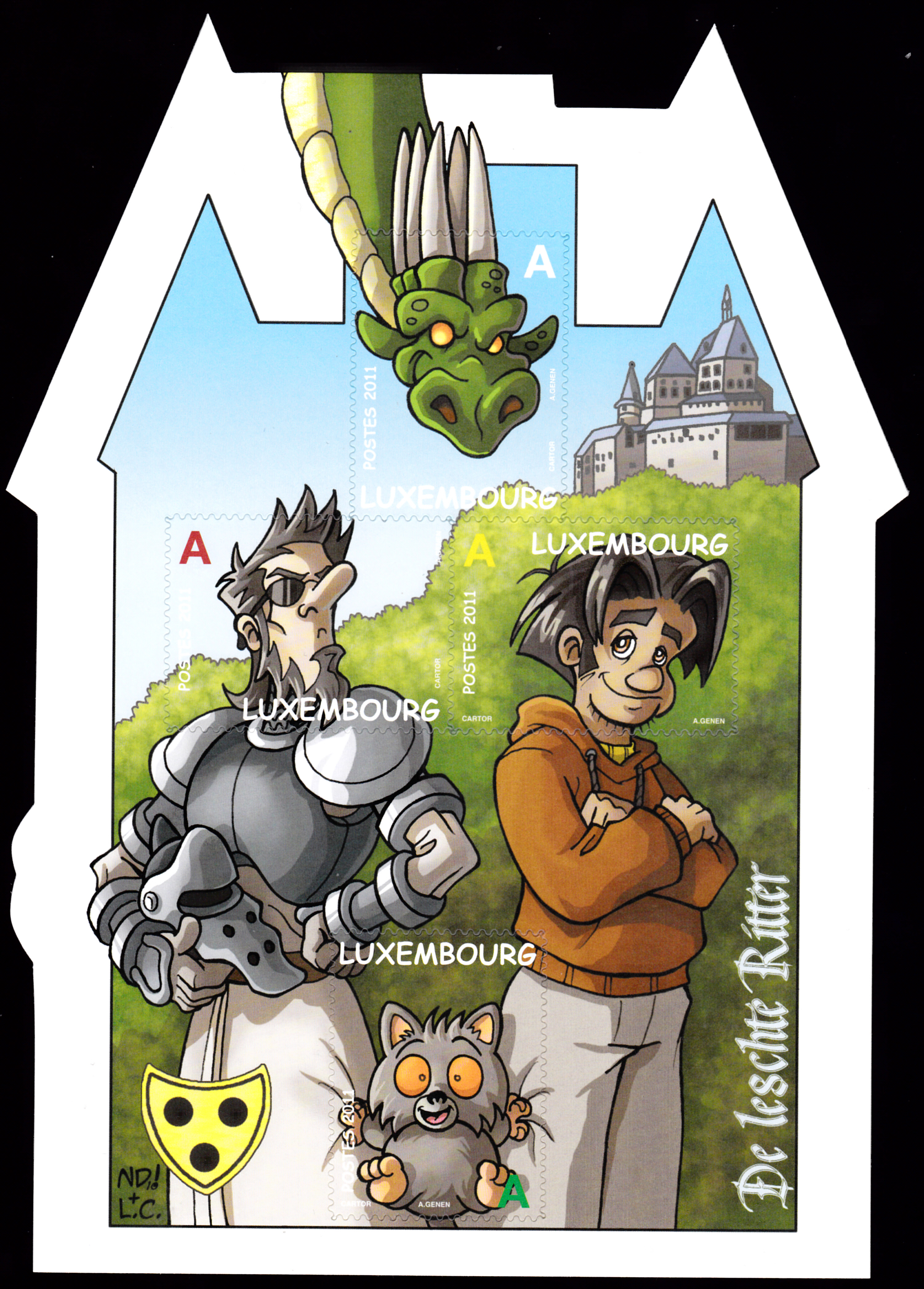 Auf vier Marken aus einem Block werden Figuren aus "De Leschte Ritter" gezeigt. Diese Marke (MiNr 1908) zeigt einen Drachen. Die Nominale zur Zeit der Ausgabe betrug 0.60 €.