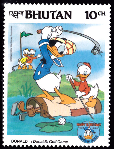 In einer Serie "50 Jahre Walt-Disney-Figur Donald Duck im Film" ist in Bhutan diese Marke (MiNr 890 A) mit einer Darstellung mit Donald und den Drillingen Tick, Trick und Track aus dem Zeichentrickfilm "Donald’s Golf Game" (1938).