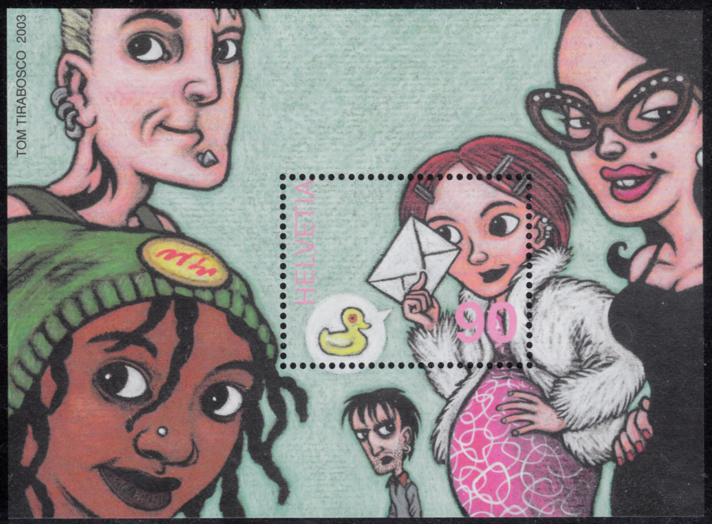Zu dieser Ausgabe gehört auch noch eine Blockausgabe (MiNr Block 34 mit Marke MiNr 1843). Der Block zeigt die Comiczeichnung "Heidi kündet ihren Freunden das baldige freudige Ereignis an".