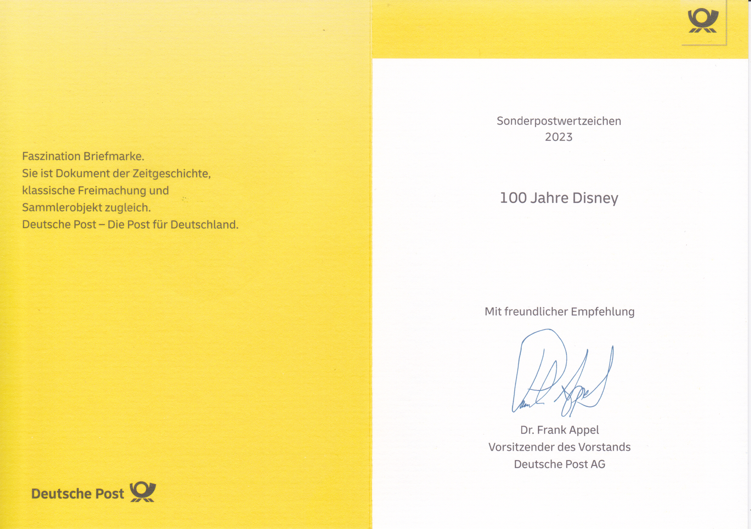 Klappkarte des Vorstandsvorsitzenden der Deutschen Post AG mit einer Marke (MiNr 3754) zum Jubiläum "100 Jahre Walt Disney Studios" und dem Ersttagsonderstempel Bonn.