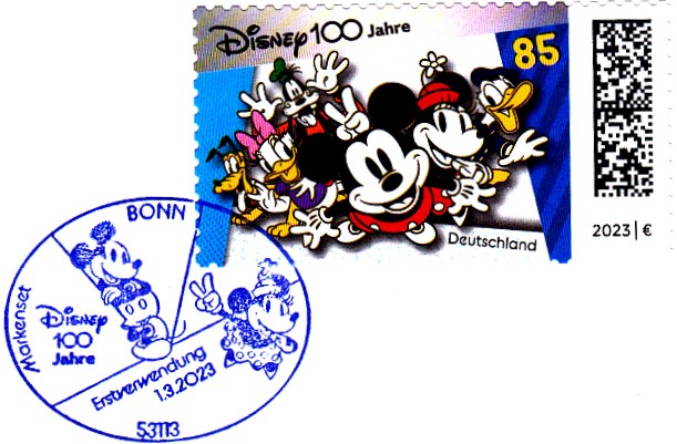 Klappkarte des Vorstandsvorsitzenden der Deutschen Post AG mit einer Marke (MiNr 3754) zum Jubiläum "100 Jahre Walt Disney Studios" und dem Ersttagsonderstempel Bonn.