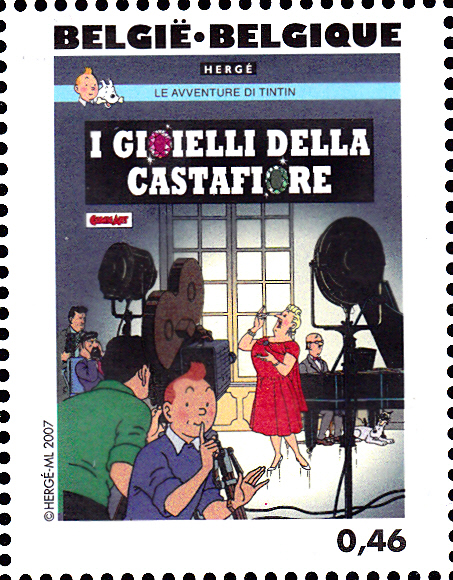 Marke (MiNr 3705) mit dem Titelbild des "Tim-und-Struppi-Albums "Die Juwelen der Sängerin"" (1963) in Italienisch.