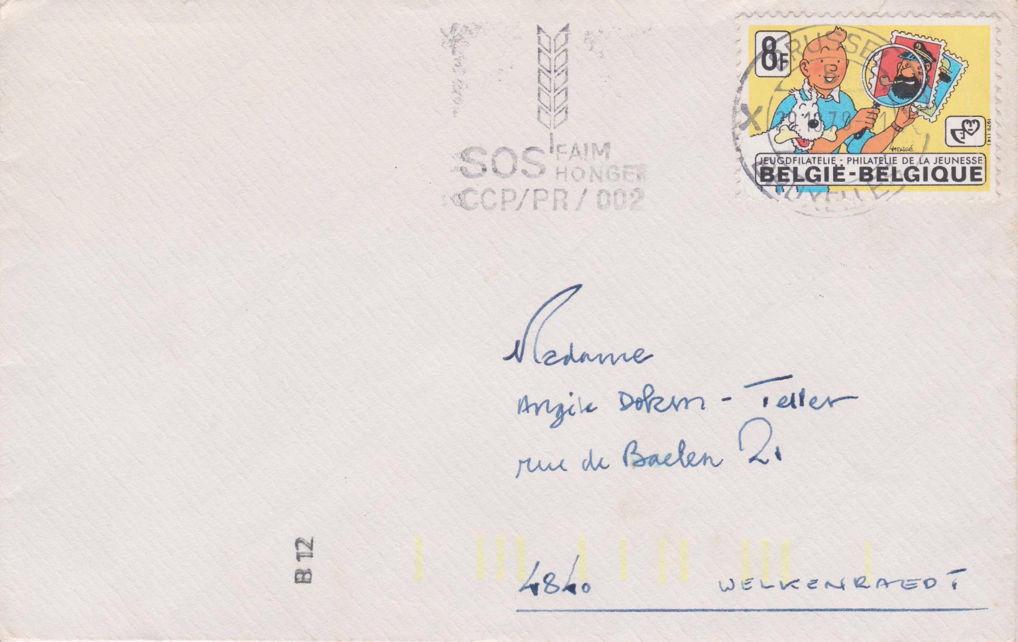 Einzelfrankatur der Sondermarke Belgien MiNr. 1979 zur Jugendphilatelie, Motiv "Tim und Struppi beim Briefmarkensammeln", verwendet am 29.10.1979 auf Brief von Brüssel nach 4840 WELKENRAEDT: