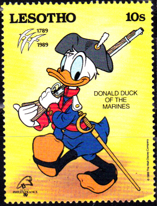 Zur Internationalen Briefmarkenausstellung PHILEXFRANCE ’89 in Paris anläßlich dem 200. Jahrestag der Französischen Revolution erschien in Lesotho eine Markenserie mit Walt-Disney-Figuren in Uniformen dieser Zeit.