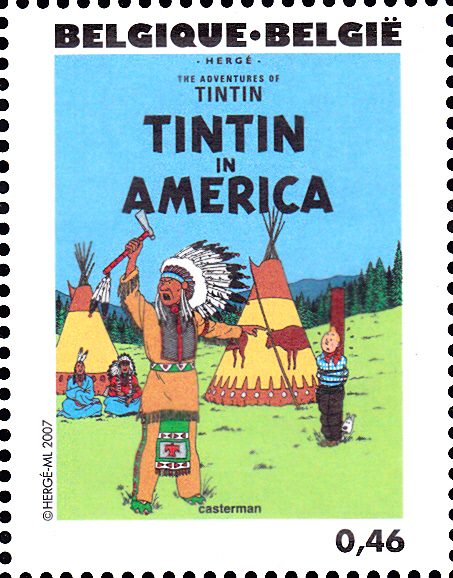 Marke (MiNr 3686) mit dem Titelbild des "Tim-und-Struppi-Albums "Tim im Amerika" (1931) in Englisch.