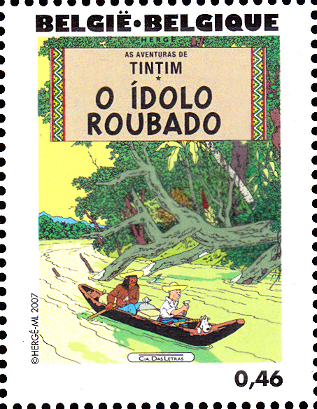 Marke (MiNr 3689) mit dem Titelbild des "Tim-und-Struppi-Albums "Der Arumbaya-Fetisch "" (1935) in Portugiesisch.