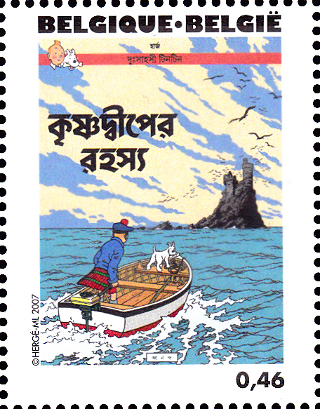 Marke (MiNr 3690) mit dem Titelbild des "Tim-und-Struppi-Albums "Die Schwarze Insel "" (1937) in Bengalisch.