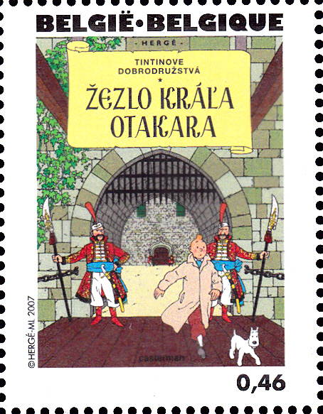 Marke (MiNr 3691) mit dem Titelbild des "Tim-und-Struppi-Albums "König Ottokars Zepter "" (1938) in Slowakisch.