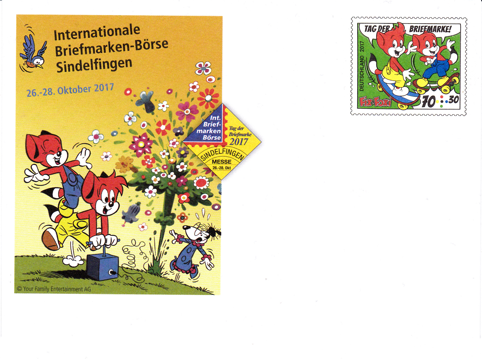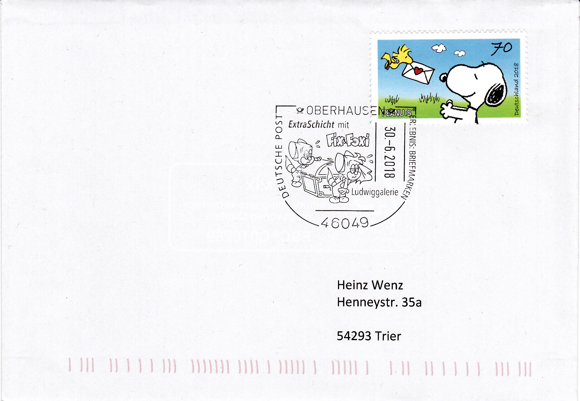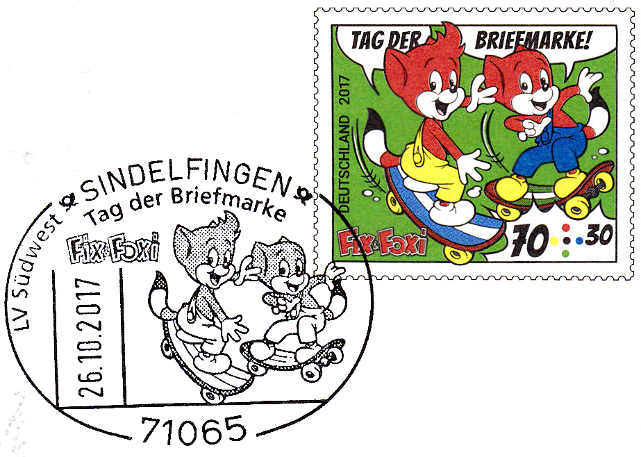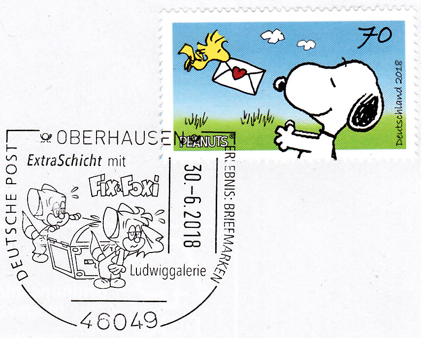 Hier folgt noch einmal der gleiche Sonderstempel aus Oberhausen mit der Abbildung von Fix und Foxi beim Tragen einer Truhe. OmmUnterschied zum vorigen Beleg passt hier auch das Markenmotiv viel besser zum Stempelmotiv. Bei der Aufnahme von Briefen mit Sonderstempel in ein Exponat für eine Wettbewerbsausstellung sollten die Aussteller nach Möglichkeit Briefe bevorzugen, bei denen eine motivliche Übereinstimmen zwischen Stempel- und Markenbild vorliegt.